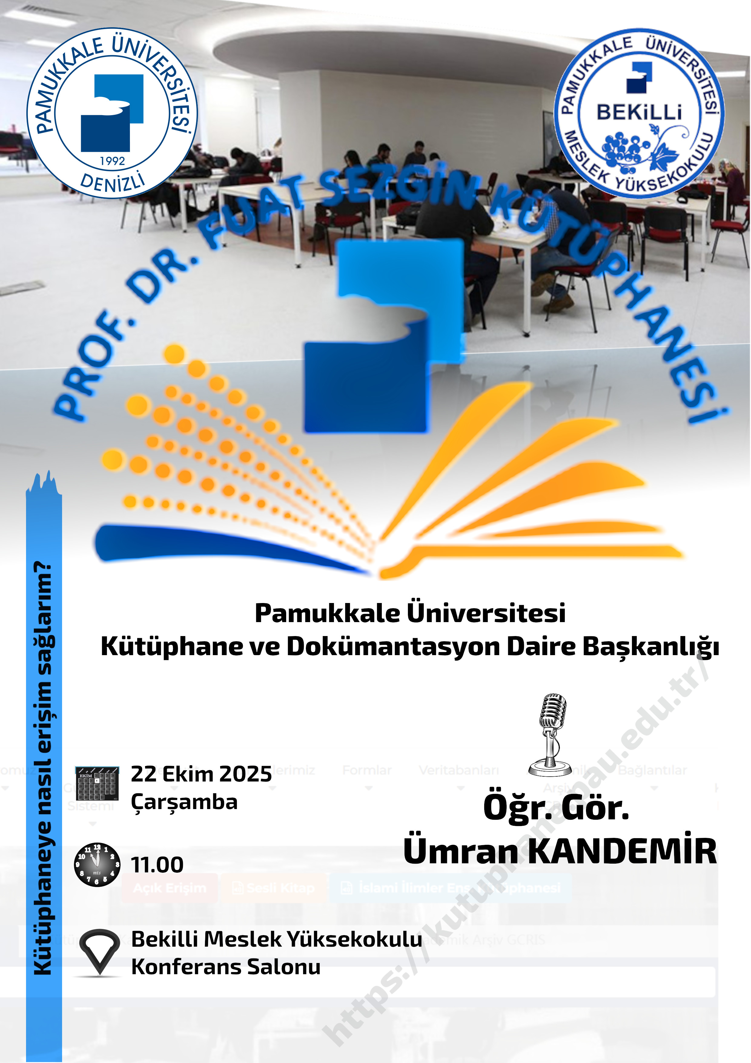 Prof. Dr. Fuat Sezgin Kütüphanesi ve Kullanımına Yönelik Bilgilendirme Semineri Seminer 22 Ekim 2025 Bekilli MYO Konferans Salonu Sahne Alanlar: ÖĞR. GÖR. ÜMRAN KANDEMİR