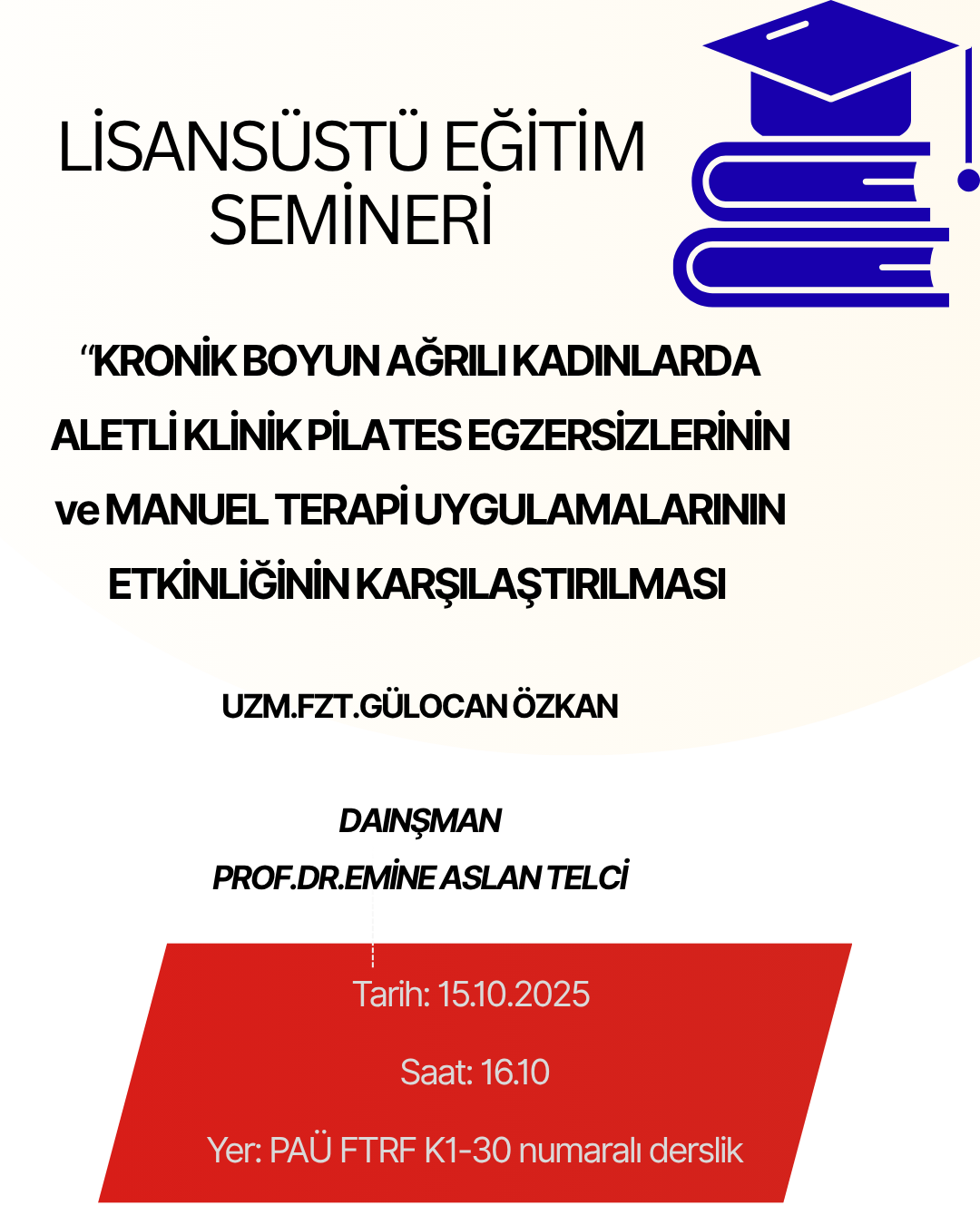 LİSANSÜSTÜ EĞİTİM SEMİNERİ Seminer 15 Ekim 2025 - 15 Ekim 2027 Fizyoterapi ve Rehabilitasyon Fakültesi