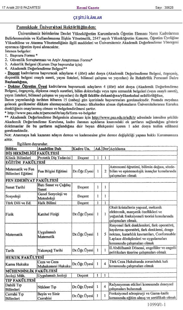 Öğretim Üyesi İlanı Eklenme Tarihi: 17 Aralık 2018 Üniversitemiz öğretim üyesi alım ilanı 17 12 2018 tarihli Resmi Gazetede yayımlanmıştır
