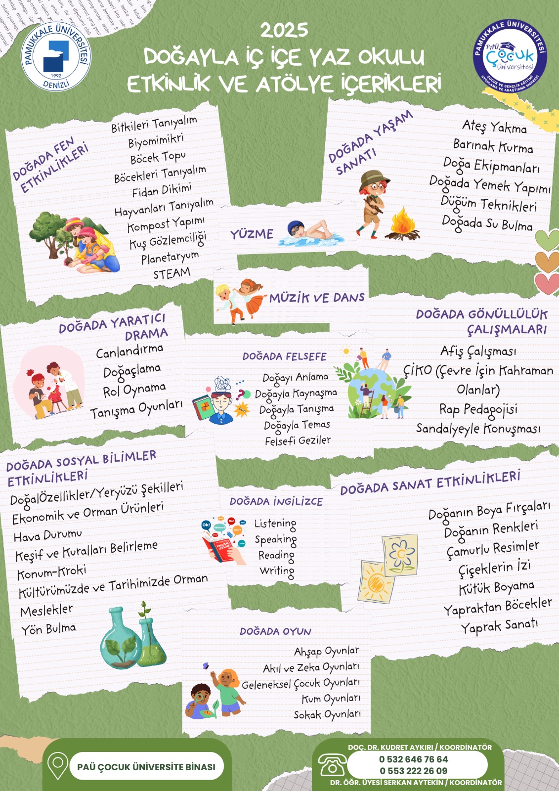 PAÜ Çocuk Üniversitesi (Pamukkale Üniversitesi Çocuk ve Gençlik Eğitimi Uygulama ve Araştırma Merkezi) tarafından düzenlenen Orman Okulu Temelli Yaz Okulu Programına ilişkin afiş ekte yer almaktadır.