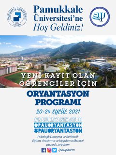 20-24 Eylül 2021 tarihleri arasında yeni kayıt yaptıran öğrenciler için gerçekleştirilen Oryantasyon Programı için planlanan sunumların tarih ve saati ile ilgili bilgileri kendi akademik biriminizin websitesindeki duyurulardan takip edebilirsiniz. Dokümanlar tabına tıklayarak oryantasyonla ilgili belgeleri indirebilirsiniz.