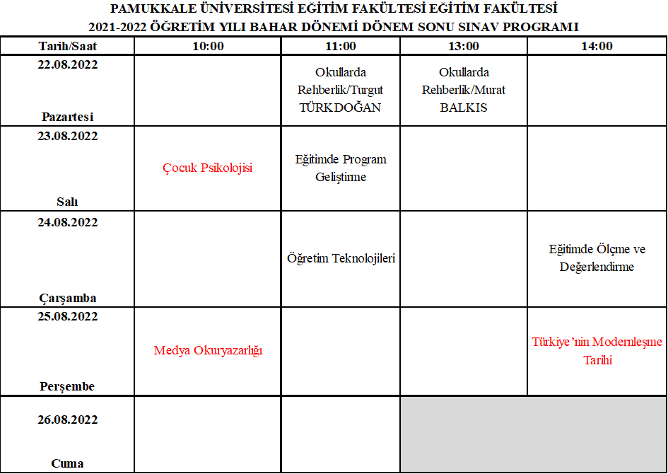Yaz Dönemi Dönem Sonu Sınav Programı