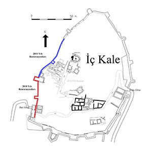 İç Kale Onarımları İzmir II Numaralı Kültür Varlıklarını Koruma Bölge Kurulu’nun 13.05.2010 tarihli ve 5762 sayılı kararı doğrultusunda 2011 yılında Ayasuluk İç Kale Batı Sur Duvarlarının İkinci Etap Restorasyon çalışmaları 02.08.2011 tarihinde başlamıştır. Önce alan temizliği ve iskele kurma çalışmaları yapılmış, 15.08.2011 tarihinden itibaren Batı Kule 3 ile Batı kule 4 arasındaki beden duvarında restorasyon çalışmalarına başlanmıştır. Kazı çalışmalarının sona ermesi dolayısıyla Bakanlık Temsilcisi’nin 09.09.2011 tarihinde kazıdan ayrılması ile çalışmalara 12.09.2011 tarihinden itibaren Genel Müdürlüğümüzün 09.09.2011 tarih ve 184928 sayılı izinleri ile Efes Müzesi Müdürlüğü denetiminde devam edilmiştir ve 30.11.2011 tarihinde genel temizlik yapılarak sona ermiştir. İç Kale Batı Sur Duvarları onarım yapılan alanlar (kırmızı renki alanlar 2010 yılını, mavi renkli alanlar ise 2011 yılını gösterir). 2011 yılı restorasyon çalışmaları BK3 - BK5 arasındaki 55 m.lik bölümde gerçekleşmiştir. Öncelikle BK3 ile BK5 arasında ortalama 10.00 m. yükseklikte ahşap iskeleler kurulmuştur. Sonra BK3’ün kuzeyinde temel seviyesine kadar yıkılmış olan 13.00 uzunlukta ve 2.20 m. genişlikteki beden duvarı seyirdim yeri ve dendanlar dahil onarılmıştır. Seyirdim yerinin genişliği güneyde 70 cm. iken kuzeye doğru 170 cm.ye kadar genişlemektedir. BK3 - BK4 Arası 2011 yılı onarım çalışmaları Batı Kule 3’ün kuzeyindeki fazlaca yıkılmış olan beden duvarlarında başlamış BK3–BK4 arasındaki toplam 24.00 m’lik bölümde sürdürülmüştür. BK3-BK4 arasında beden duvarı düz bir hat şeklinde olmayıp ortada (10. m den sonra) doğuya doğru kılarak devam etmektedir. Duvarlarda orijinal duvar örgü sistemine bağlı kalınarak onarımlar yapılmıştır. Tamamen yıkılmış olan güney kısımda 7.00 m lik beden duvarında dış yüzde 6.00 m. iç yüzde 3.00 m onarım yapılarak seyirdim yeri seviyesine ulaşılmış ve BK3’ten 3 merdiven basamağı ile seyirdim yerine inilmesi sağlanmıştır. BK3-BK4 arasında kuzey yarıda seyirdim yeri ve dendenler yapılmadan beden duvarı BK4’e bağlanmıştır. Bu bölümde duvar örgüsü üzerine harç dolgusunun daha az olduğu moloz taş dolgu şeklinde yıkıntı görüntüsü kazandırılmıştır. Bunun nedeni duvarın hemen yanındaki Bey Köşkü ve üçgen planlı odalara ait duvarların yıkıntı şeklinde bir görünüme sahip olması ve bu alanda birlikteliğin sağlanmasıdır. BK 4 Tümüyle kayalık ve engebeli zemin üzerine oturan Batı Sur duvarlarının orta kısmında yer alan BK4 dışa çıkıntılı normal bir kule şeklinde değil arazinin zorlaması sonucu içe dönük olarak planlanmıştır. Bu haliyle dışarıdan bakıldığı zaman kule olarak algılanamaz. İç Kale Hamam yapısının GB kısmında yer alan kulenin dış ölçüleri 4.18 x 4.00 m. olan kule (içe dönük) kare planlıdır. Onarım çalışmaları kulenin güney cephesinde başlamıştır. Güneybatı köşede dış yüzde 3.40 m yükselen duvar toplamda yapılan onarım çalışmaları ile 7.50 m yüksekliğe ulaşmıştır. Güneydoğu köşede ise mevcut olan duvarda güçlendirme çalışmasıyla beraber yapılan onarımla, duvar yüksekliği 2.40 m, doğu cephede ise 1.40 m yüksekliğe ulaşmıştır. BK4’ün iç duvar sınırları kalabilen izlerden yararlanılarak ortaya çıkmış ve bu çalışma sonrasında iç kısımda ‘L’ şeklinde seyirdim yeri oluşturulmuştur. BK 4 - BK 5 Arası BK4 4 ile BK 5 arasındaki sur duvarında, kalınlığı 1.35 m olan 31.50 m’lik bölümde çalışılmıştır. Dış yüzde 4.40 - 2.20 m arasında sağlam kalabilen beden duvarı iç yüzde ise 0.50 m. ile 0.70 m. arasında kalabilmiştir. Ana kaya üzerinde yükselen sur duvarlarının alt kısmında dışa çıkıntı yapan 10.50 m uzunluğunda 0.60 m kalınlığındaki kısım onarılarak 1.00 yüksekliğe ulaştırılmıştır. Sonuç olarak 2011 yılında BK3-BK5 arasındaki sur duvarlarında toplam olarak 55.50 m. lik bölümde onarım çalışmaları yapılmıştır. Böylece kalenin batı cephesi ziyaretçiler için tehlikesiz hale gelirken, önemli bir anıtsallık ve görsellik kazanmıştır. Bu haliyle kalenin ziyarete açılması engelleyen faktörlerden biri büyük çapta azalmış ve Kale’nin 2012 yılında ziyarete açılması olanaklı hale gelmiştir. İç Kale Batı Sur Duvarları (2009) İç Kale Batı Sur Duvarları (2010 sonu) İç Kale Batı Sur Duvarları (2011 sonu) İç Kale (2010 sonu) İç Kale (2011 sonu)
