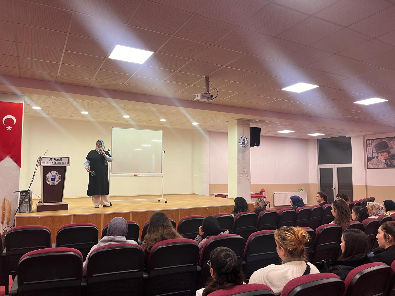 Pamukkale Üniversitesi Acıpayam Meslek Yüksekokulu, 2025 Aile Yılı etkinlikleri kapsamında Acıpayam İlçe Müftülüğü ile birlikte Peygamberimiz ve Aile Hayatı konulu bir konferans gerçekleştirdi. İlçe Vaizi Merve Sözen'in konuşmacı olduğu etkinlikte Peygamberimizin hayatından örneklerle aile olmanın önemi ele alındı. Mahremiyet, ahlak, aile hayatı, ailede sevgi ve saygının önemi gibi önemli konu başlıklarının da anlatıldığı konferansın bitiminde Büro Hizmetleri ve Sekreterlik Bölümü Başkanı Öğr. Gör. Dr. Simge Şimşek konuşmacı Merve Sözen'e teşekkür belgesi takdim etti.