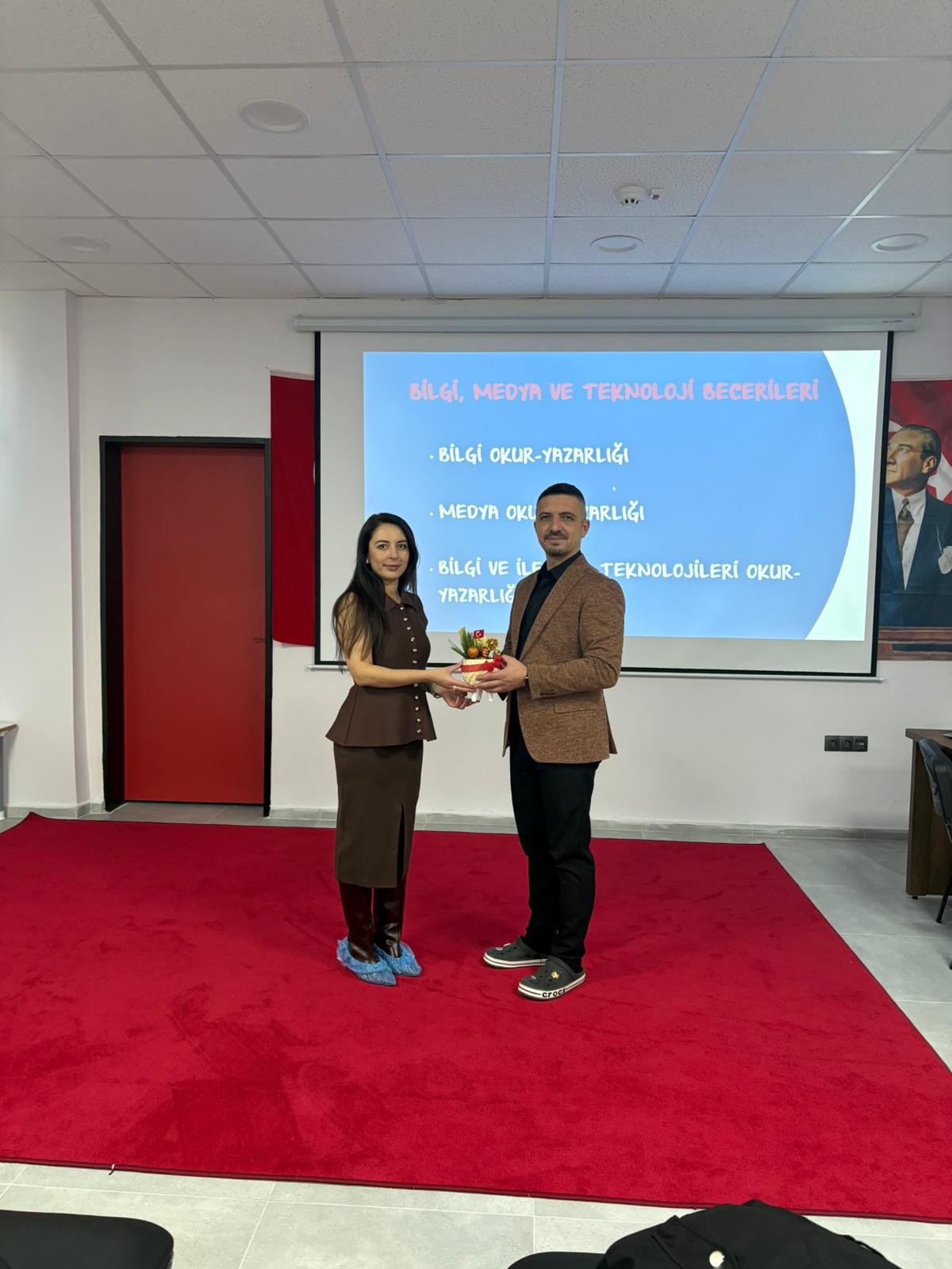 Eğitim sonunda Acıpayam Türkiye Odalar ve Borsalar Birliği Anaokulu Müdürü Çağatay Öney, Öğr. Gör. Dr. Fatma Özge ÖZGEN ÖNEY’e teşekkür belgesi takdim etti.