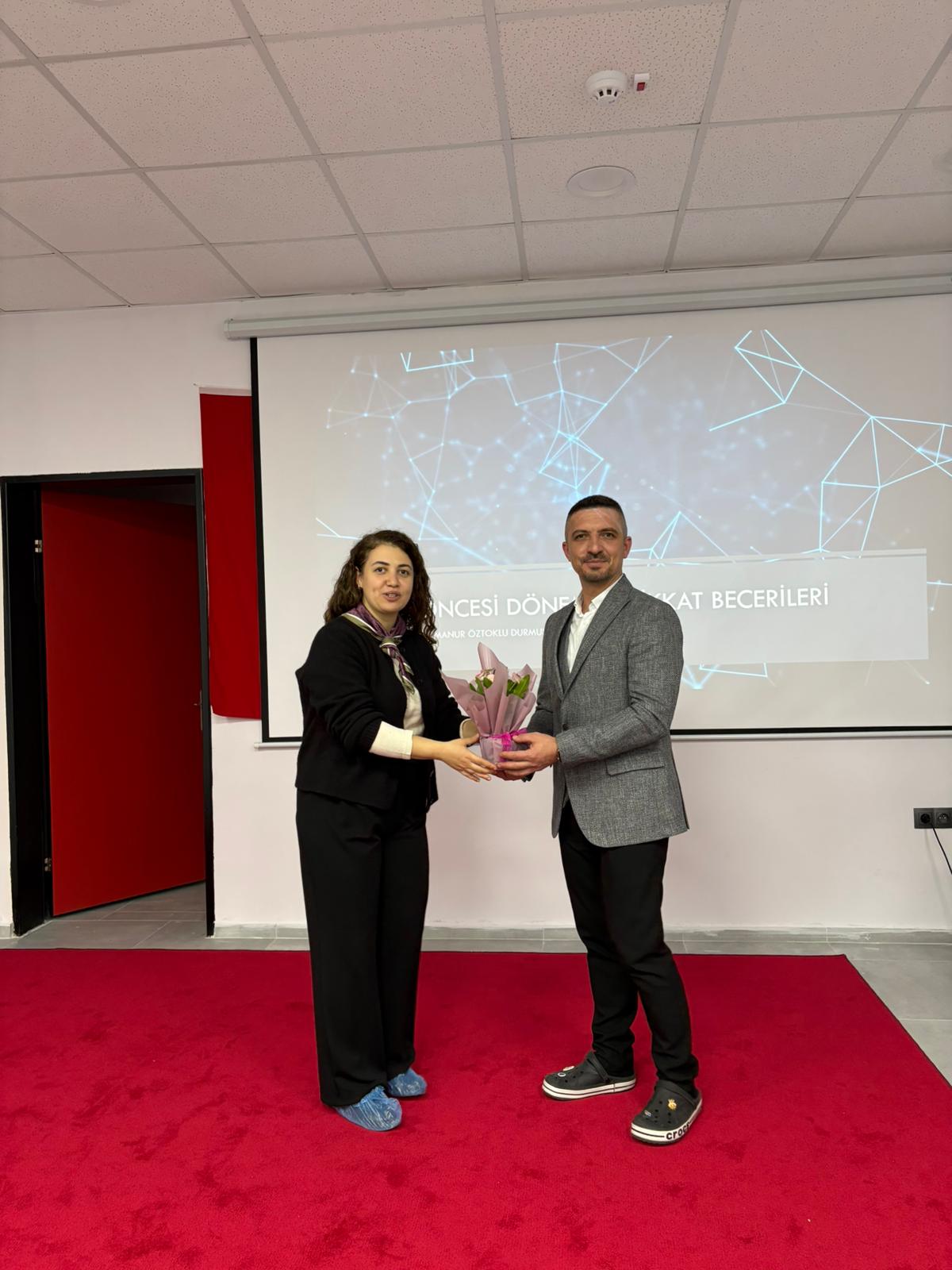 Eğitim sonunda Acıpayam Türkiye Odalar ve Borsalar Birliği Anaokulu Müdürü Çağatay Öney, Öğr. Gör. Dr. Fatmanur Öztoklu Durmuş’a teşekkür belgesi takdim etti.