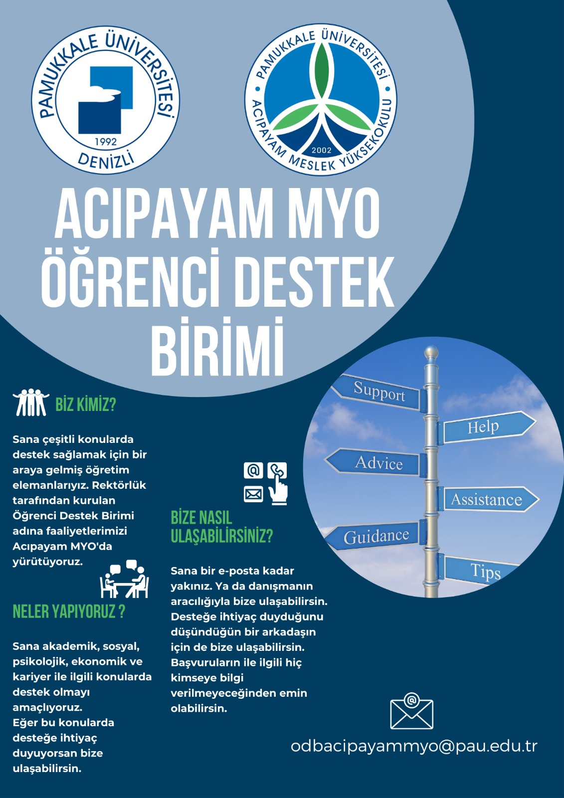 Acıpayam MYO olarak siz değerli öğrencilerimize psikolojik, sosyal, akademik ve kariyer konularında destek vermek, sorunlarınıza çözüm önerileri sunmak için Öğrenci Destek Birimi Rektörlük bünyesinde kurulmuştur.