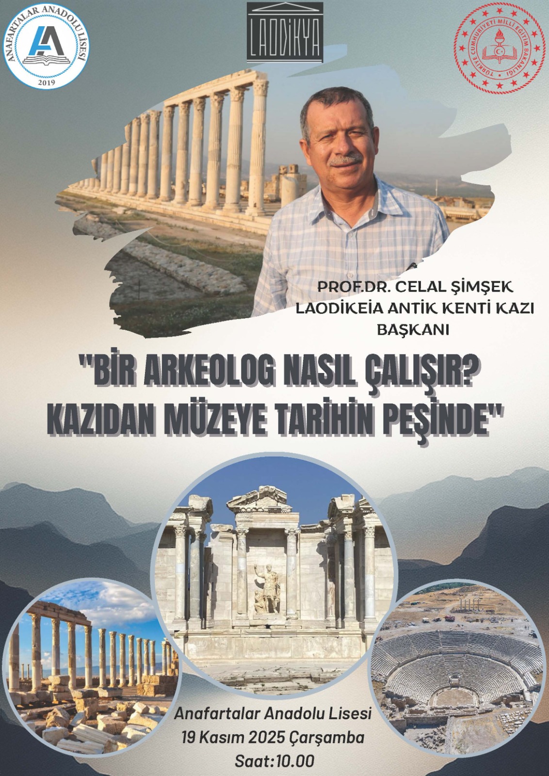 Arkeoloji Bölüm Başkanı ve Laodikeia Antik Kenti Kazı Başkanı Prof. Dr. Celal ŞİMŞEK "Bir Arkeolog Nasıl Çalışır? Kazıdan Müzeye Tarihin Peşinde" başlıklı konferansını 19 Kasım 2025 Çarşamba Günü Saat 10.00'da Anafartalar Anadolu Lisesi'nde gerçekleştirecektir. Bir arkeoloğun çalışma disiplinine ışık tutacak bu konferansı dinlemek isteyenleri bekliyoruz...