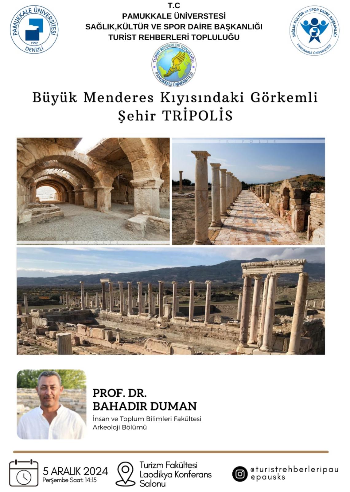 Büyük Menderes Kıyısındaki Görkemli Şehir TRİPOLİS isimli konferans Prof. Dr. Bahadır DUMAN'ın sunumuyla 5 Aralık 2024 Perşembe Saat 14.15'te Turizm Fakültesi Laodikya Konferans Salonu'nda gerçekleştirilecektir.