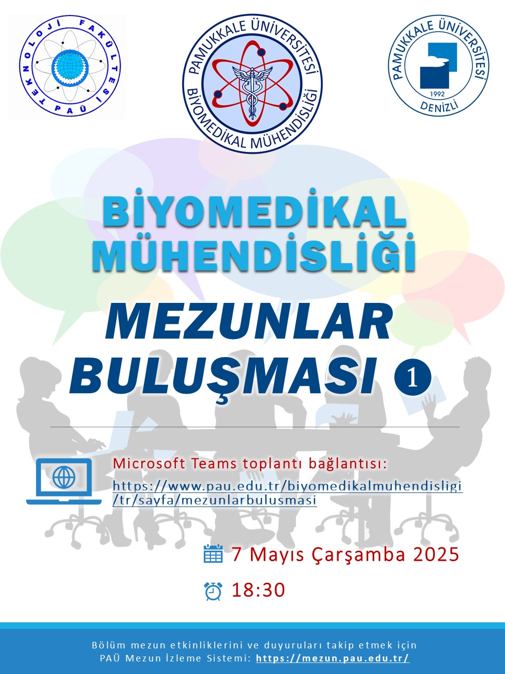 Biyomedikal Mühendisliği Mezunlar Buluşması - 1 Etkinlik 07 Mayıs 2025 Online https://www.pau.edu.tr/biyomedikalmuhendisligi/tr/sayfa/mezunlarbulusmasi Biyomedikal Mühendisliği Mezunlar Buluşması - 1 Tüm mezunlarımız ve öğrencilerimiz davetlidir. Tarih ve saat: 7 Mayıs Çarşamba 2025 18:30 Microsoft Teams toplantı bağlantısı: https://teams.microsoft.com/l/meetup-join/19%3ameeting_NDBiODUzYTMtZWZiNS00ZTMzLWE2ZmYtZWIwZTQ1ZGQ5MmZl%40thread.v2/0?context=%7b%22Tid%22%3a%224b55b462-e98f-4bba-a0b1-9d792ff93016%22%2c%22Oid%22%3a%22d09a8e1d-4348-4138-ae3d-2245f5376d03%22%7d