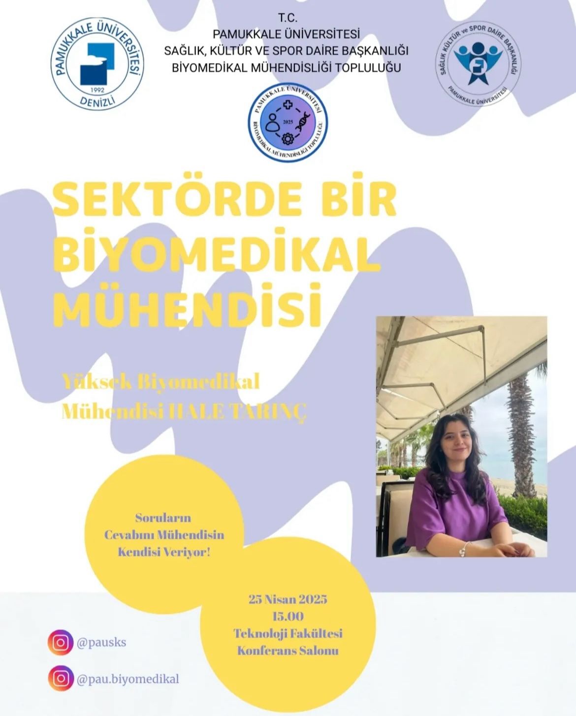 Biyomedikal Mühendisliği Topluluğu’nun düzenlediği "Sektörde Bir Biyomedikal Mühendisi" etkinliğinde mezunlarımızdan Biyomedikal Yüksek Mühendisi Hale TARINÇ mesleki yolculuğunda yaşadıklarını ve edindiği tecrübeleri öğrencilerimizle paylaşacaktır. Tüm öğrencilerimiz davetlidir.