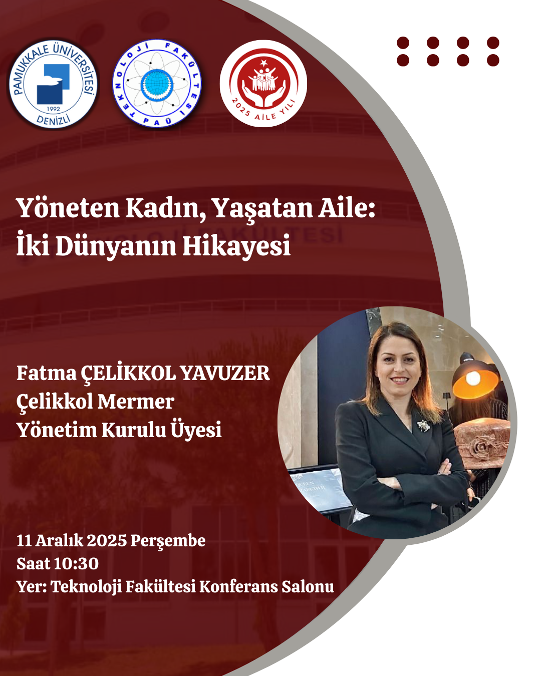 "Yöneten Kadın, Yaşatan Aile: İki Dünyanın Hikayesi" Söyleşi 11 Aralık 2025 Teknoloji Fakültesi Konferans Salonu Sahne Alanlar: Fatma ÇELİKKOL YAVUZER (Çelikkol Mermer Yönetim Kurulu Üyesi) Sponsorlar: Çelikkol Mermer Saat ⏰: 10:30