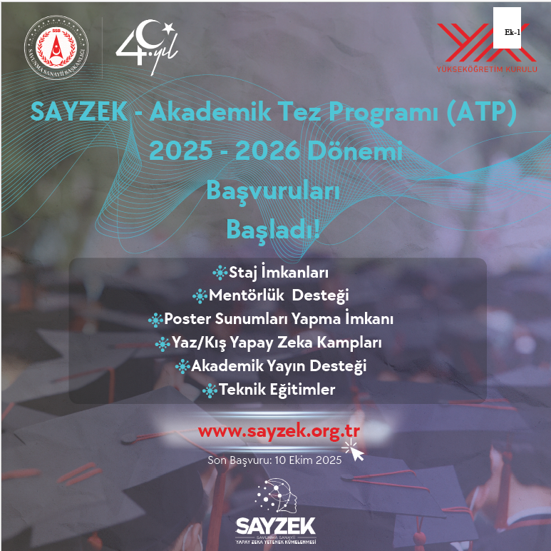 Savunma Sanayii Başkanlığı ve Yükseköğretim Kurulu iş birliğiyle yürütülen Yapay Zekâ Akademik Tez Programı (SAYZEK-ATP) 2025-2026 dönemi başvuruları başlamıştır.