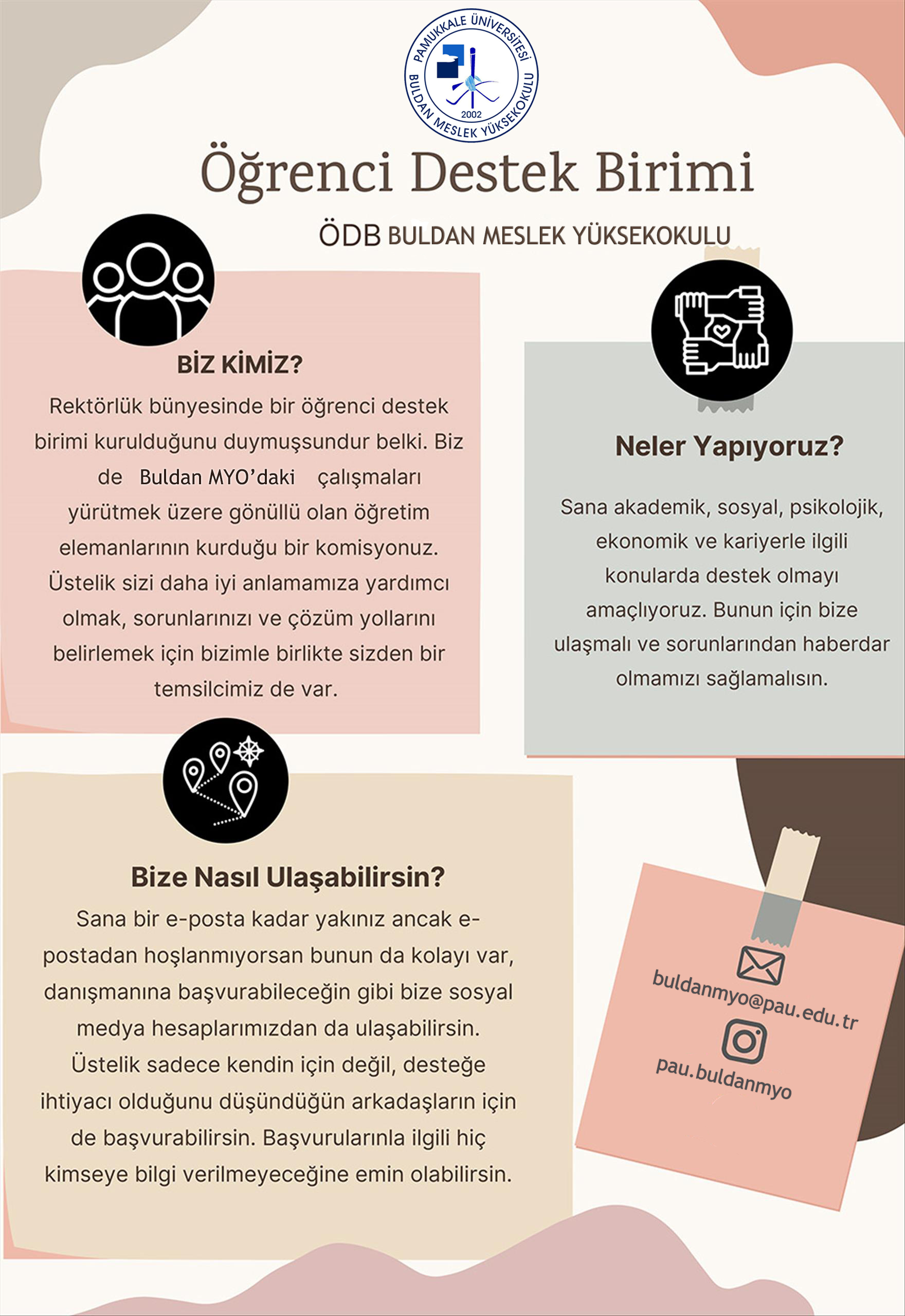 Meslek Yüksekokulumuz öğrencilerine psikolojik, sosyal, akademik, ekonomik ve kariyer ile ilgili konularda destek olmayı amaçlayan bir birimdir. Bunun için bize ulaşmalı ve sorunlarından haberdar olmamızı sağlamalısınız.