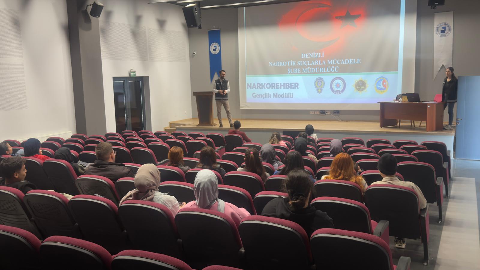 Narko Gençlik Eğitimi Düzenlendi. Güncellenme Tarihi: 12 Ocak 2026 Meslek Yüksekokulumuz öğrencilerine; Denizli Emniyet Müdürlüğü’ne bağlı Narkotik Suçlarla Mücadele Şube Müdürlüğü tarafından 17.10.2025 tarihinde Narko Gençlik Eğitimi verildi. Narkotik suç unsurları ve bağımlılık konusunda bilgilendirmeler yapıldı.