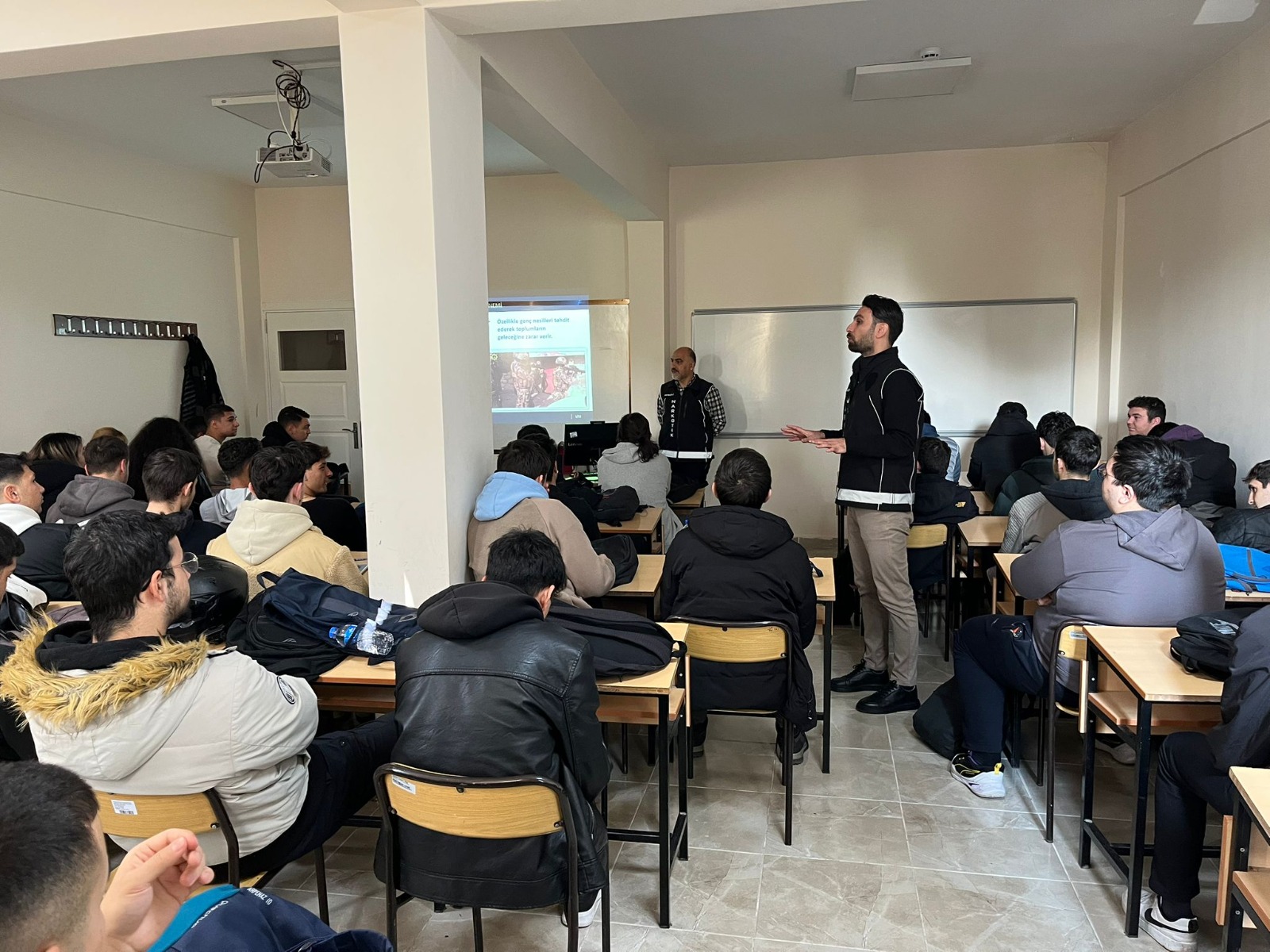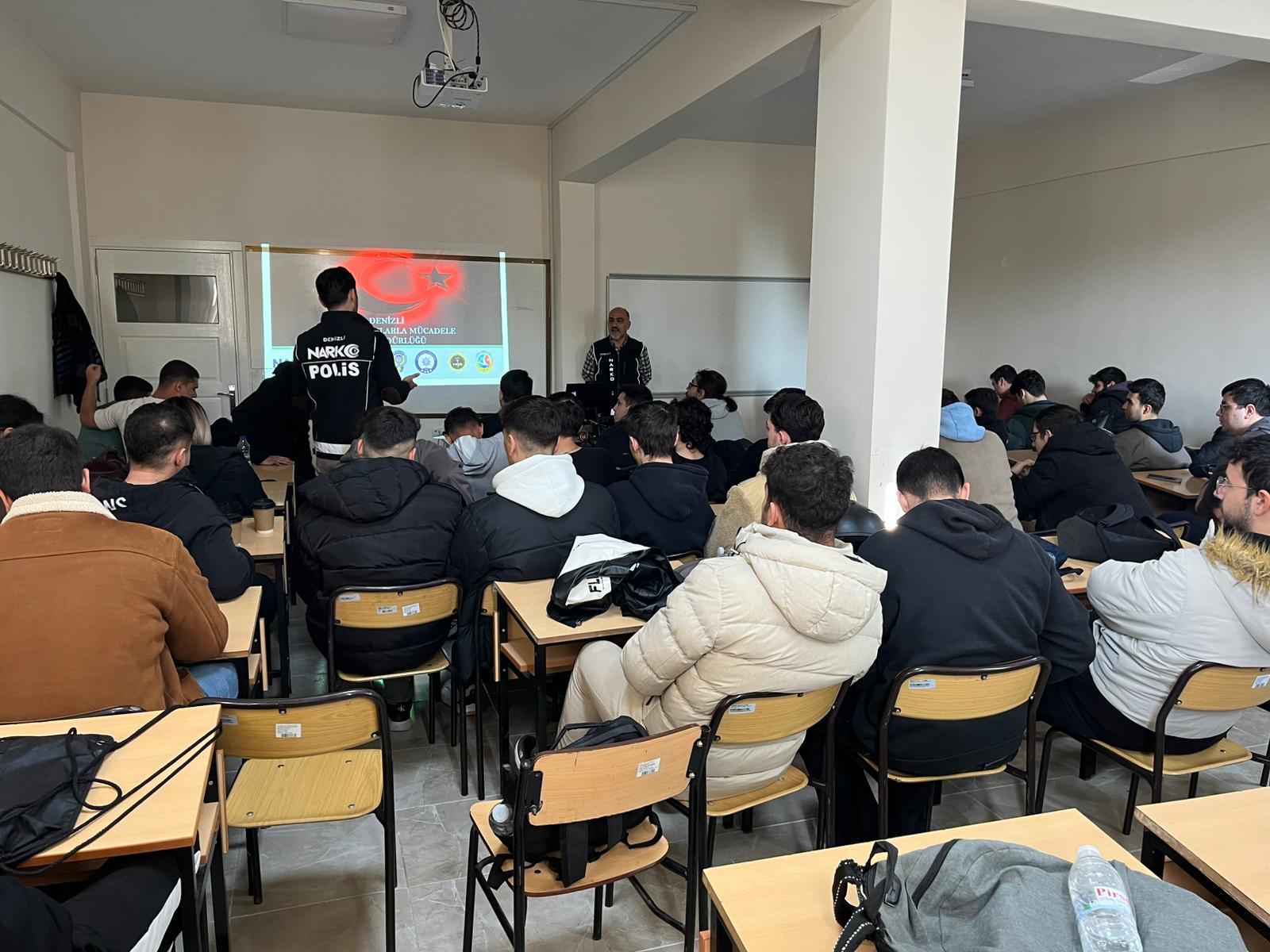Narkotik Şube görevlileri, öğrencilere uyuşturucuyla mücadele kapsamında madde türleri, bağımlılık süreci, korunma yöntemleri, farkındalık oluşturma çalışmaları ve uygulanan yasal süreçler hakkında kapsamlı bilgiler verdi.