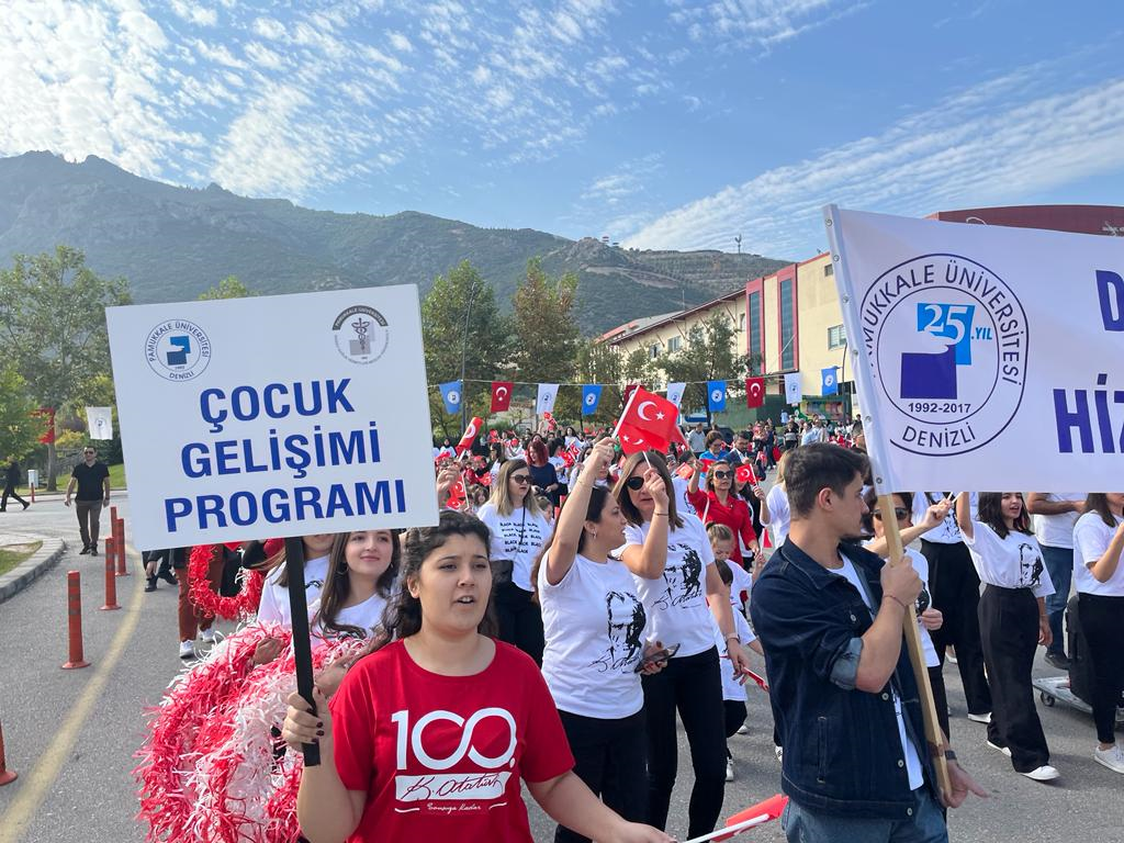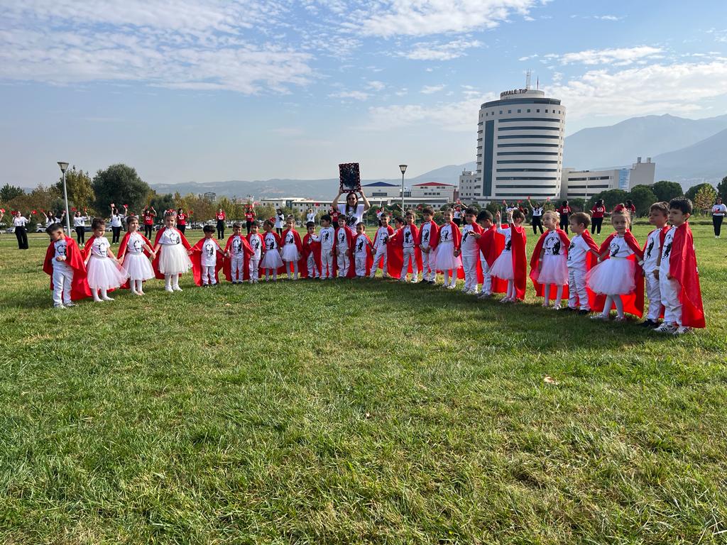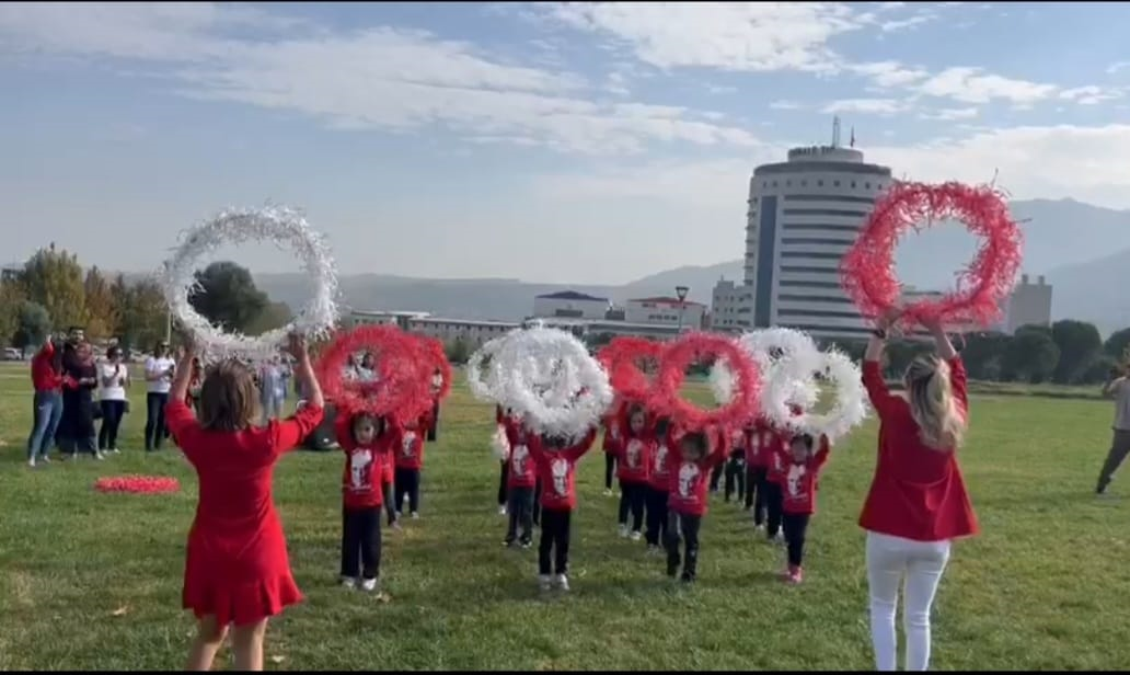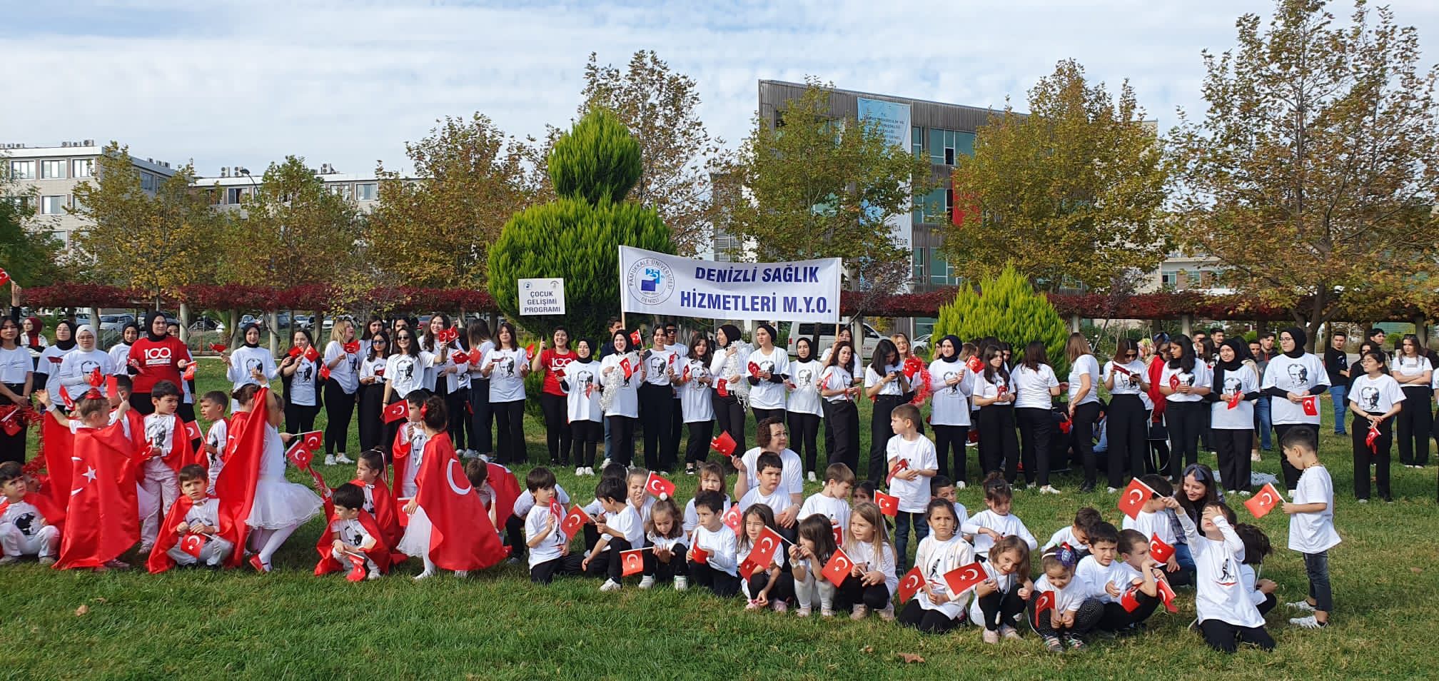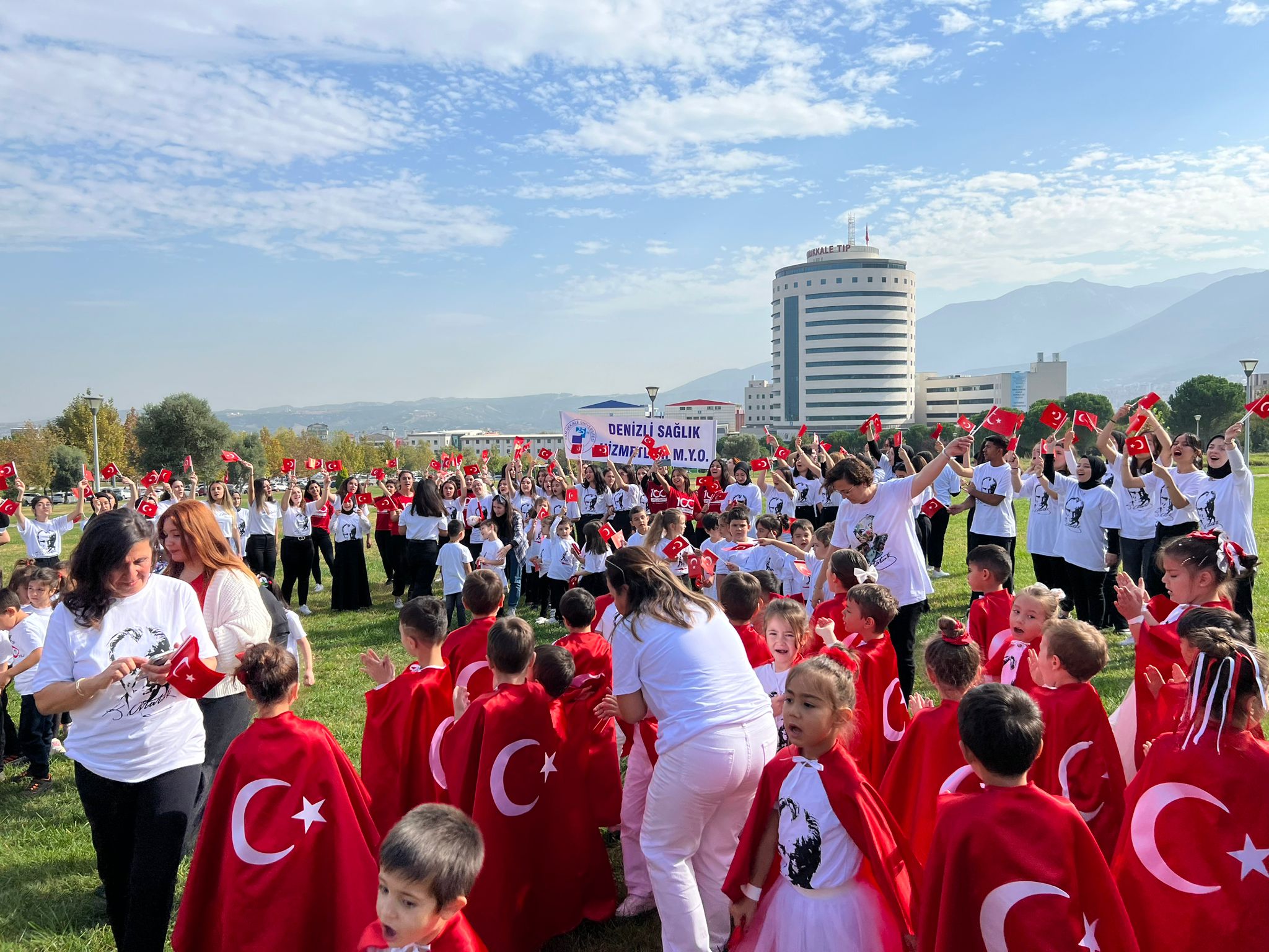 “Cumhuriyetimizin 100. yılı 100 çocukla büyük bir coşkuyla kutlandı.” Etkinlik 02 Kasım 2023 - 31 Aralık 2024 PAÜ Sahne Alanlar: Denizli Sağlık Hizmetleri Meslek Yüksekokulu Çocuk Gelişimi Programı “Cumhuriyetimizin 100. yılı 100 çocukla büyük bir coşkuyla kutlandı.” Pamukkale Üniversitesi Denizli Sağlık Hizmetleri Meslek Yüksekokulu Çocuk Gelişimi Programı’nın hazırladığı, Hasan Veli Üğür Anaokulu öğretmen ve çocukların davetli olarak katıldıkları “Cumhuriyetimizin 100. yılını 100 çocuk ile kutluyoruz” etkinliği gerçekleştirildi. Etkinliğe Hasan Veli Üğür Anaokulu’ndan 100 çocuk katıldı. Etkinlik Pamukkale Üniversitesi Gölbahçe alanından marşlar eşliğinde kortej yürüyüşü ile başladı. Yürüyüş Denizli Sağlık Hizmetleri Meslek Yüksekokulu Müdürü Doç. Dr. Pınar İli, Çocuk Gelişim Programı Bölüm Başkanı Prof. Dr. Özlem Körükçü, bölüm öğretim elemanları Dr. Öğr. Üyesi Hande Güngör, Öğr. Gör. Dilek Uludağ Kodal ve Hasan Veli Üğür Anaokulu Müdürü Münire Kiriş ile birlikte 5 yaş öğretmenleri ve öğrencileri ile gerçekleştirildi. Sonrasında “Cumhuriyetimizin 100. Yıl etkinliği” Denizli Sağlık Hizmetleri Meslek Yüksekokulu önünde Atatürk ve Cumhuriyet temalı dans etkinlikleri ile devam etti. Etkinlikte Minik Damlalar ve Mutlu Çocuklar sınıflarının hazırlamış olduğu “Atatürk Çocukları”, Doğadaki Sesler sınıfının hazırladığı “Canımız Feda” dans gösterisi ile Deniz Yıldızları sınıfının “Türk Genciyiz” gösterileri büyük ilgi gördü. Son olarak 100. yıl etkinliği, Minik Kalpler sınıfının Pamukkale Üniversitesi Çocuk Gelişimi Programı öğrencileri ile birlikte yaptıkları “İzmir Marşı” gösterisi ile son buldu. “Cumhuriyetimizin 100. yılını 100 Çocuk ile kutluyoruz” etkinliği, kampüsteki öğrenci ve personel tarafından ilgiyle ve merakla izlendi.