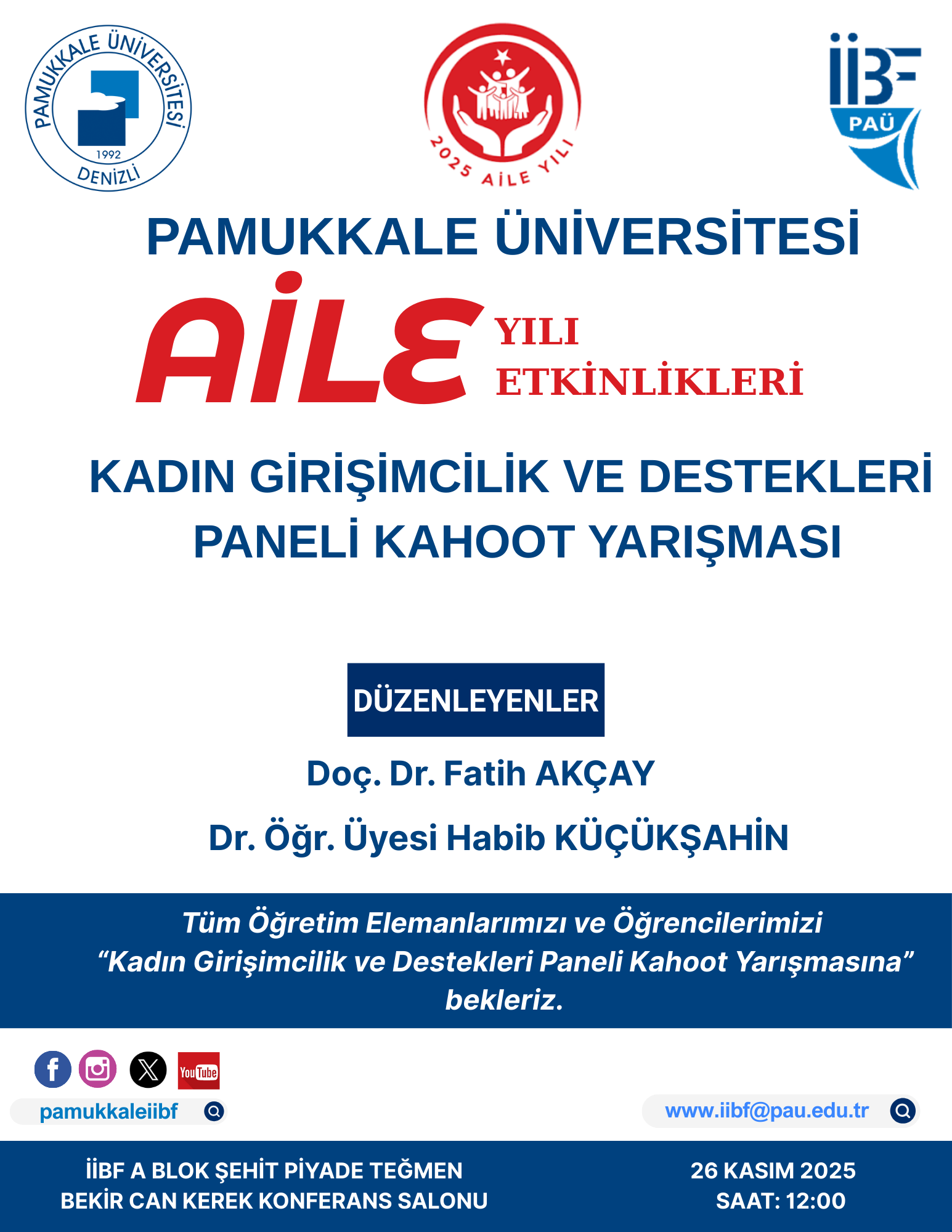 "Kadın Girişimcilik ve Destekleri Paneli Kahoot Yarışması" Yarışma 26 Kasım 2025 İİBF A BLOK KONFERANS SALONU 26 Kasım 2025 tarihinde Fakültemizde yapılacak olan "Kadın Girişimcilik ve Destekleri Paneli Kahoot Yarışması" konulu etkinliğimize akademisyenlerimizi ve öğrencilerimizi bekleriz.
