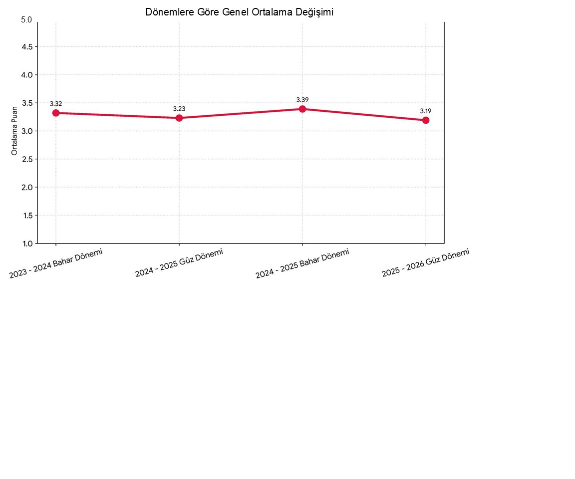 **Genel Değişim Grafiği: Dört dönem boyunca tüm derslerin genel ortalamasındaki seyri göstermektedir. Verilere göre genel ortalamada dönemler arasında küçük dalgalanmalar görülmekle birlikte, puanların 3,2 ile 3,4 bandında seyrettiği gözlemlenmiştir.