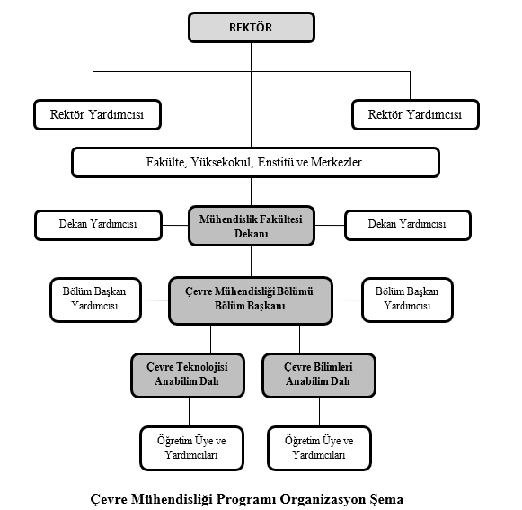 Pamukkale Üniversitesi 2547 sayılı Yükseköğretim Kanunu’na tabidir, bu nedenle tüm karar alma süreçlerinde bu kanun çerçevesinde hazırlanmış yönetmelik ve yönergeler kullanılmaktadır. Çevre Mühendisliği Lisans Programı aşağıda verilen organizasyon organizasyon şeması sürecine göre yürütülmektedir.