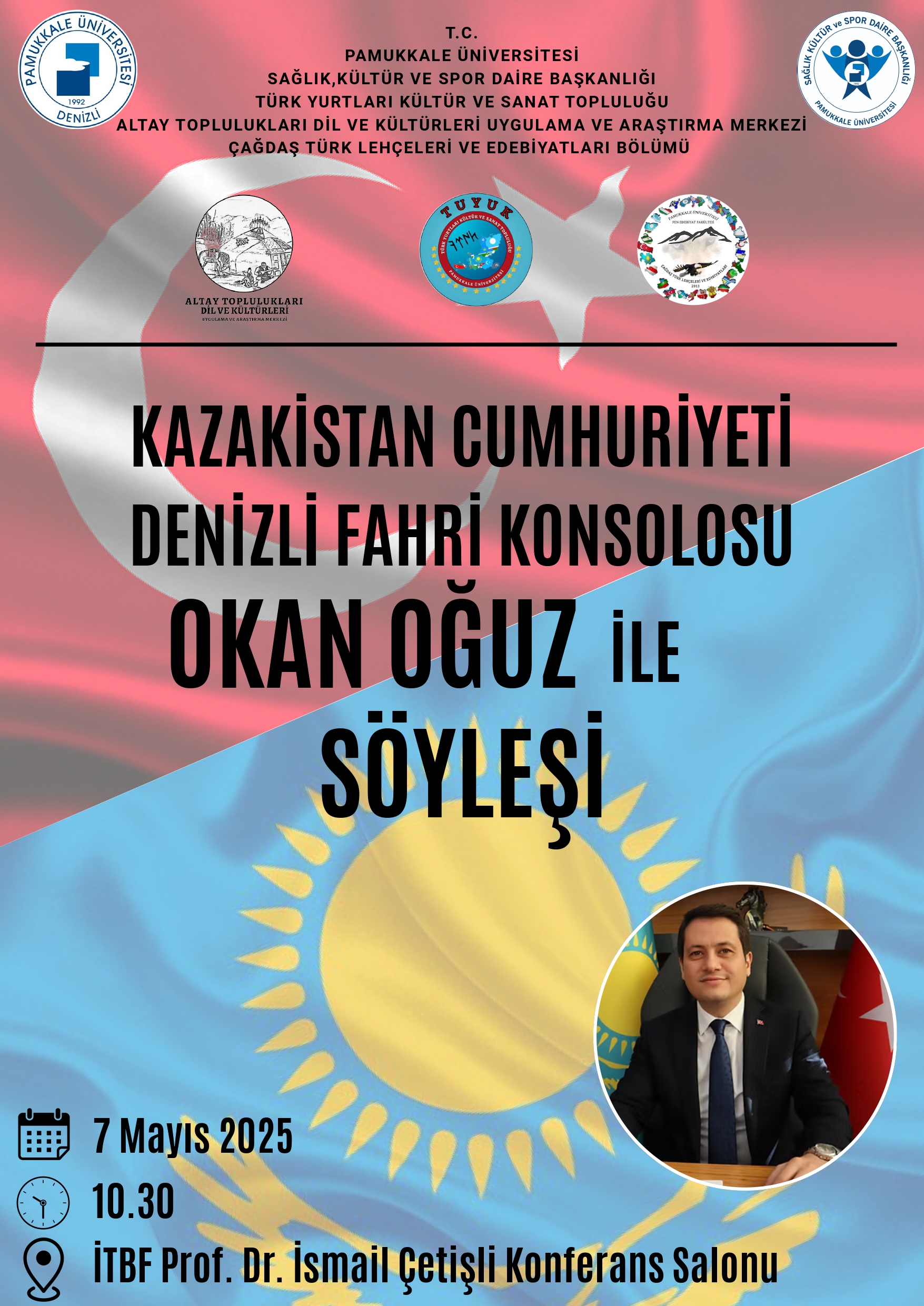 KAZAKİSTAN CUMHURİYETİ DENİZLİ FAHRİ KONSOLOSU OKAN OĞUZ İLE SÖYLEŞİ Söyleşi 07 Mayıs 2025 İnsan ve Toplum Bilimleri Fakültesi Prof. Dr. İsmail Çetişli Konferans Salonu KAZAKİSTAN CUMHURİYETİ DENİZLİ FAHRİ KONSOLOSU OKAN OĞUZ İLE KAZAKİSTAN TÜRKİYE ARASINDAKİ KÜLTÜREL İLİŞKİLER ÜZERİNE SÖYLEŞİ YAPILACAKTIR.