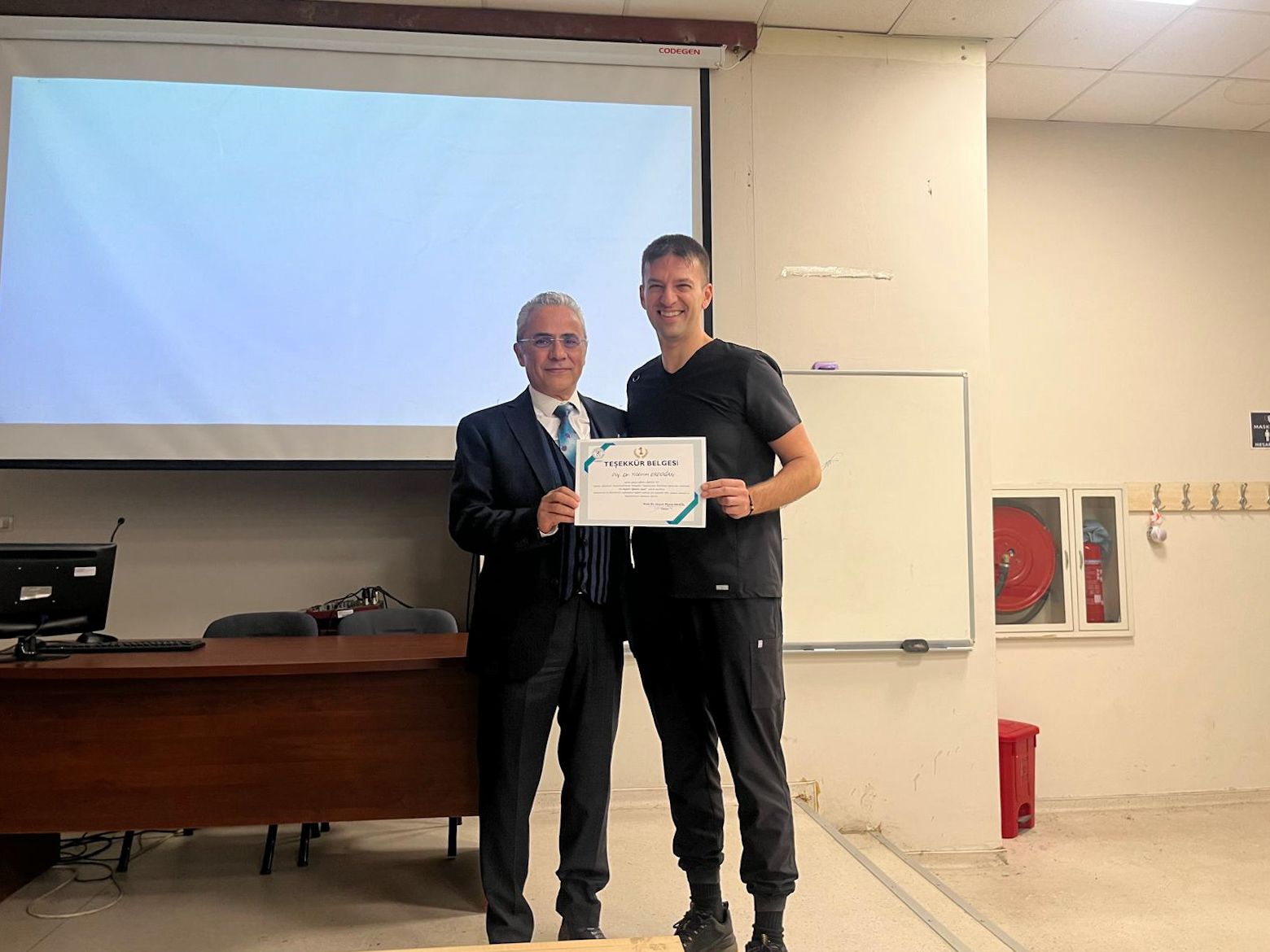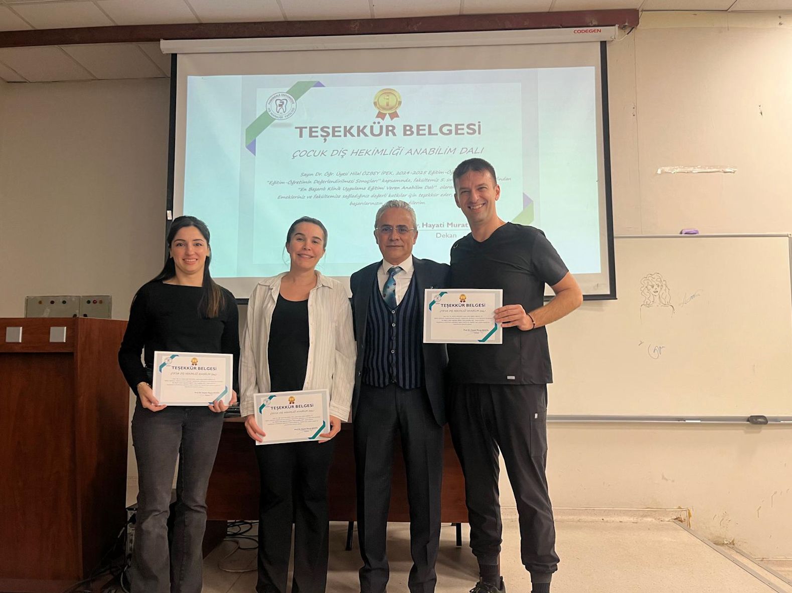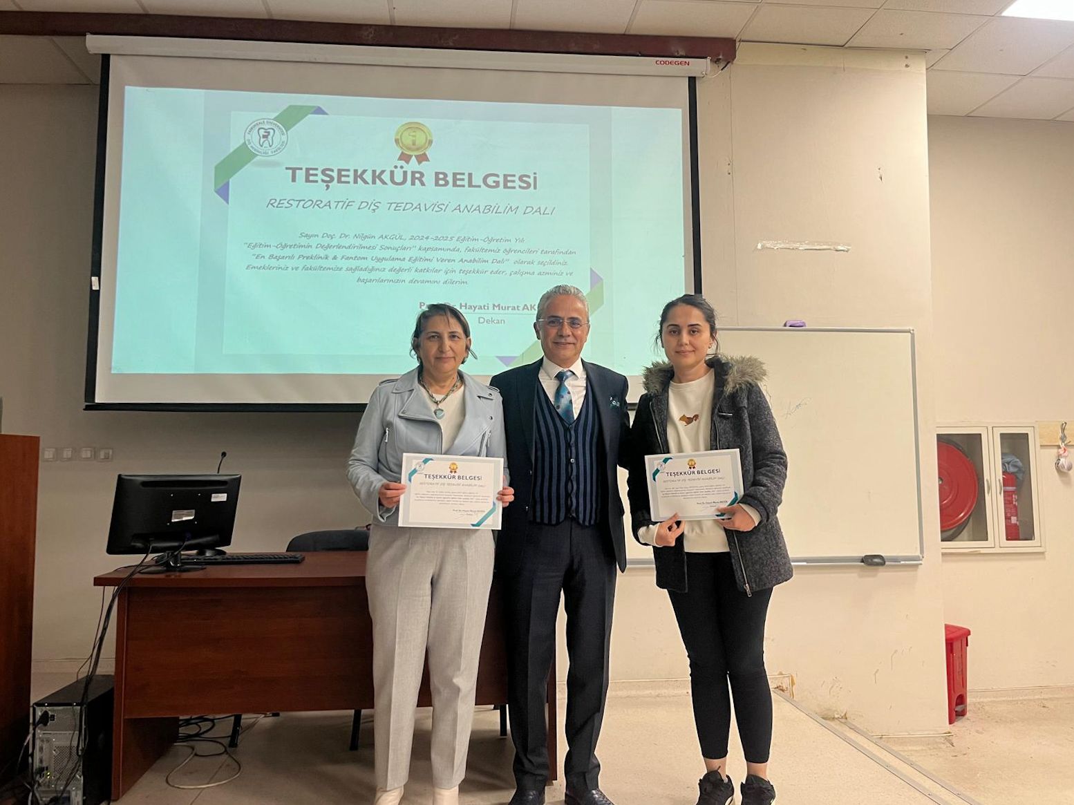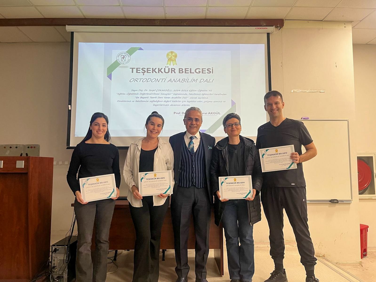 Toplantıda, Dekanımız Prof. Dr. Hayati Murat Akgül tarafından öğrenci değerlendirme sonuçlarına göre 2024-2025 Eğitim-Öğretim Yılı kapsamında; teorik eğitim, preklinik-fantom laboratuvarı uygulama eğitimi, klinik uygulama eğitimi ve öğretim üyesi performansı başlıklarında en yüksek performansa sahip öğretim üyelerine teşekkür belgeleri takdim edilmiştir.