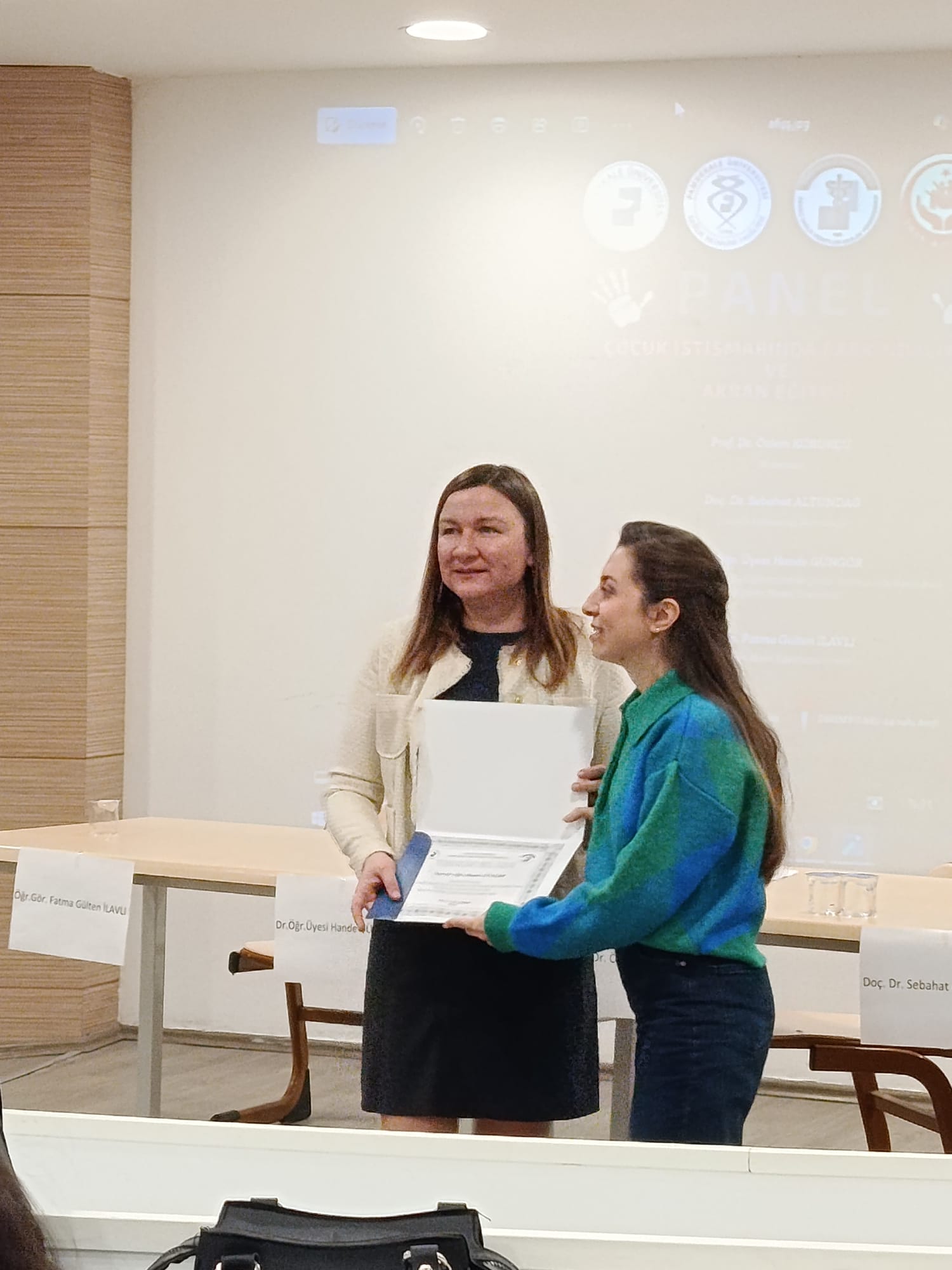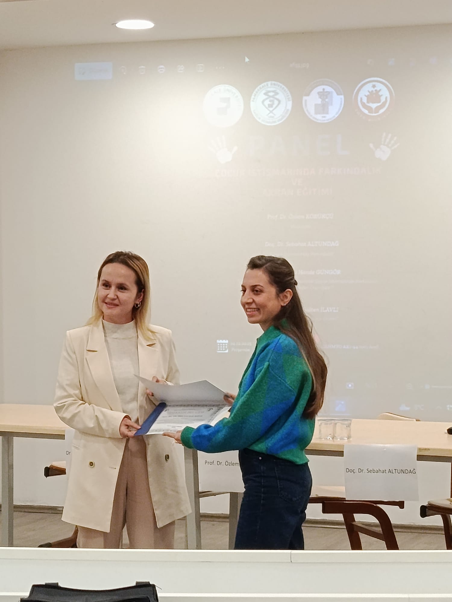 Etkinlik sonunda konuşmacılara katılım belgeleri, Sağlık Bilimleri Fakültesi Dekanı Prof. Dr. Sevgi Özkan ile DSHMYO Müdür Yardımcısı Öğr. Gör. Dr. Deniz Koçyiğit Kaplan tarafından takdim edildi.