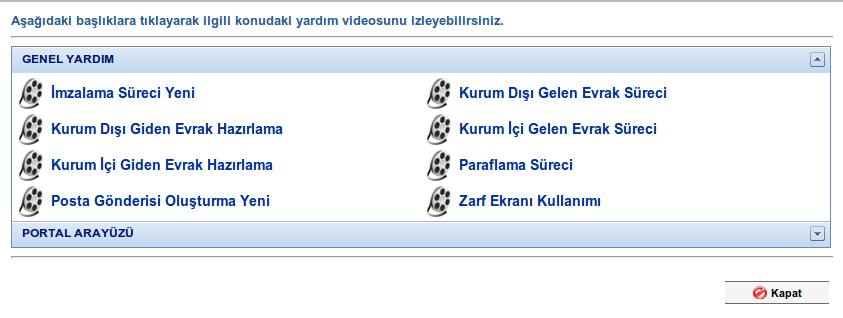 Doküman Yönetim Sistemi içinden ulaşabileceğiniz yardım videoları listesi