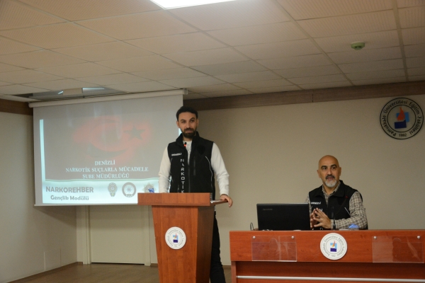 Narko Gençlik Eğitimi Güncellenme Tarihi: 05 Kasım 2025 Pamukkale Üniversitesi Eğitim Fakültesinde, Denizli İl Emniyet Müdürlüğü Narkotik Suçlarla Mücadele Şube Müdürlüğü tarafından “Narko Gençlik” semineri düzenlendi. Seminerde, öğrenciler madde bağımlılığı ve korunma yolları hakkında bilgilendirildi. Etkinlikte Özel Eğitim Öğretmenliği Bölümünden Barış Keskin, gençlik temalı bir metin okuyarak programa katkı sundu.