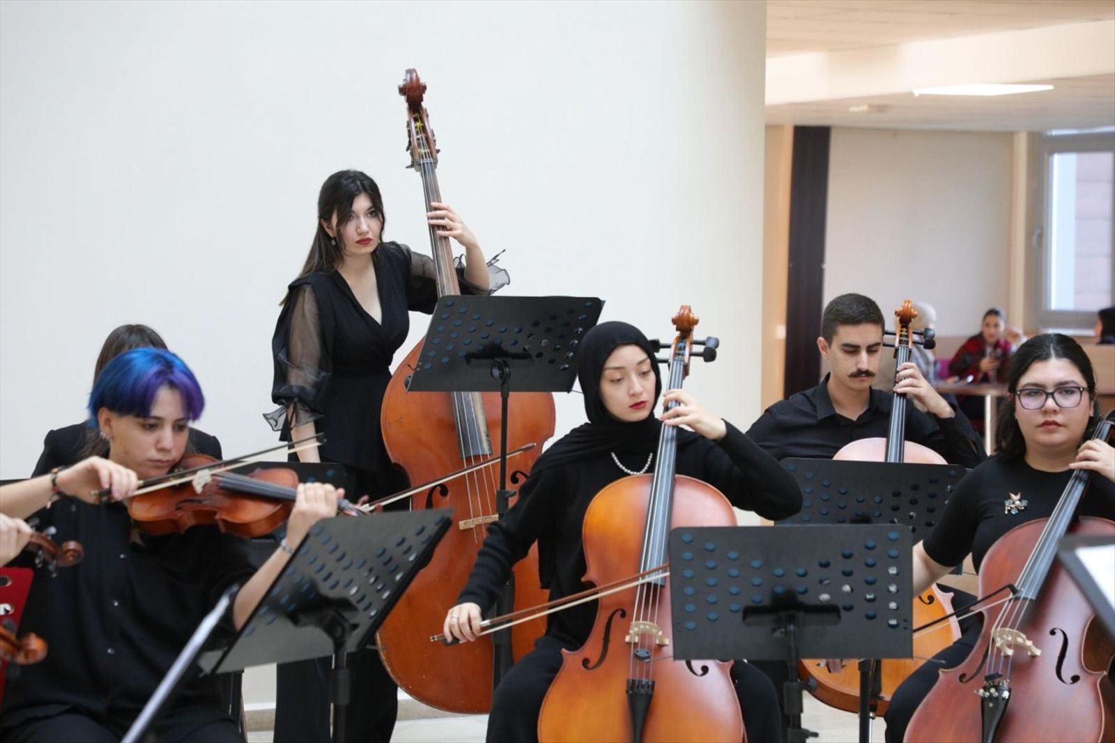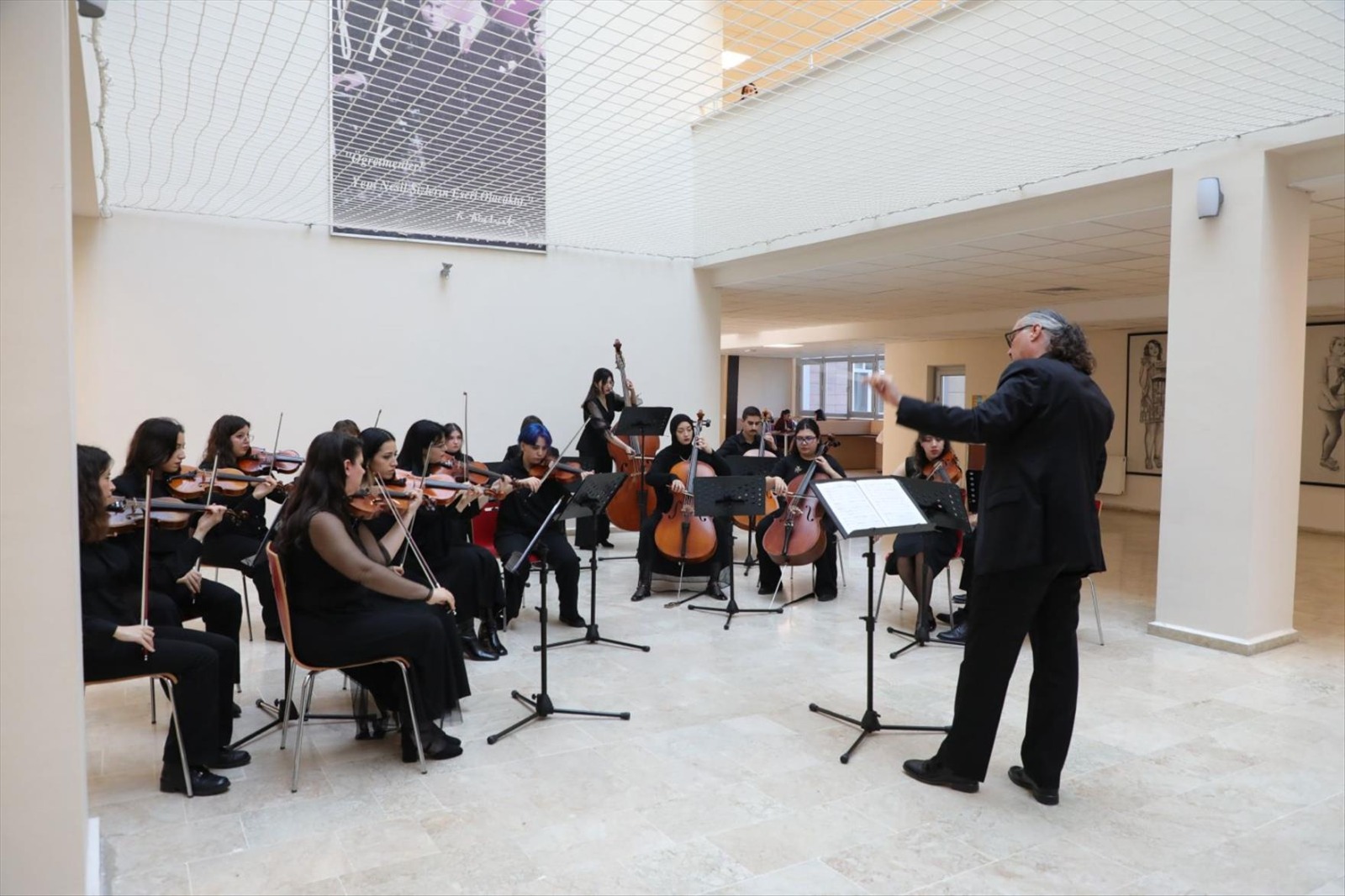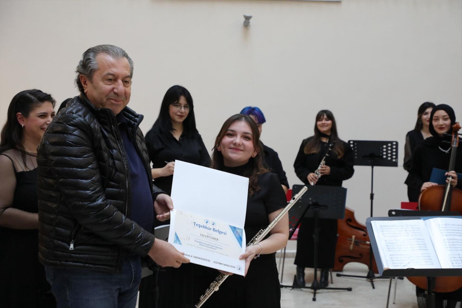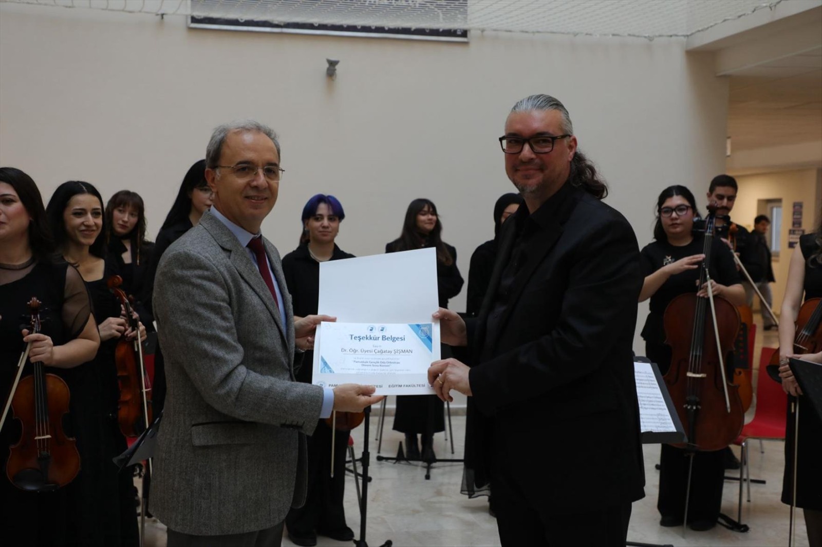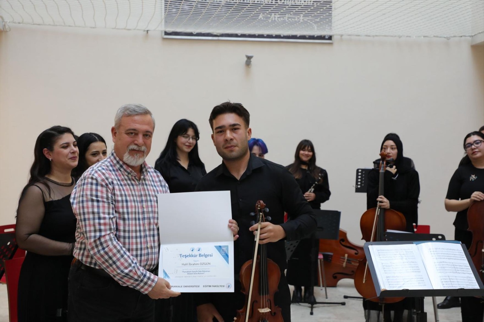 Oda Orkestrası Güncellenme Tarihi: 31 Aralık 2025 Pamukkale Üniversitesi Müzik Eğitimi Anabilim Dalı bünyesinde çalışmalarını sürdüren ve yetenekli lisans öğrencilerinden oluşan PAÜ Gençlik Oda Orkestrası, 24 Aralık tarihinde Eğitim Fakültesi Fuaye Alanı’nda izleyicileriyle buluştu. Eğitim Fakültesi Dekanı Prof. Dr. İzzet Kara, dekan yardımcıları, akademisyenler ve öğrencilerin katıldığı konsere ayrıca çok sayıda müziksever ilgi gösterdi. Fuaye Alanında Sanat Dolu Bir Mola Konser salonlarının resmi atmosferini sokağın enerjisiyle birleştiren fuaye konserinde orkestra; klasik batı müziğinin seçkin eserlerinden modern düzenlemelere uzanan geniş bir repertuvar sundu. Yaklaşık bir saat süren etkinlikte, genç müzisyenlerin performansı ve uyumu dinleyicilerden tam not aldı. Gençlik Oda Orkestrası üniversite kampüsündeki kültürel canlılığa önemli bir katkı sunarken, Türkiye’deki Müzik Eğitimi Anabilim Dalı orkestraları arasındaki prestijli konumunu perçinlemiş oldu. Akademik ve Sanatsal Başarı Bir Arada Şef Dr. Öğr. Üyesi Çağatay Şişman yönetimindeki orkestra, sergilediği profesyonel tını ve derinlikli yorumuyla Pamukkale Üniversitesi’nin sanatsal vizyonunu bir kez daha ortaya koydu. Konser sonunda uzun süre alkışlanan Gençlik Oda Orkestrasına Teşekkür Belgelerini Eğitim Fakültesi Dekanı Prof. Dr. İzzet Kara, Güzel Sanatlar Eğitimi Bölüm Başkanı Prof. Dr. Feryal Beykal, Müzik Eğitimi Ana Bilim Dalı Başkanı Prof. Dr. Ufuk Yağcı ve Prof. Dr. Efe AKBULUT takdim etti.