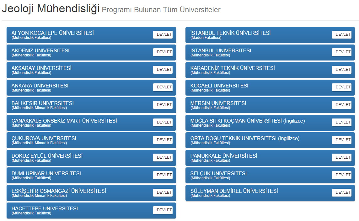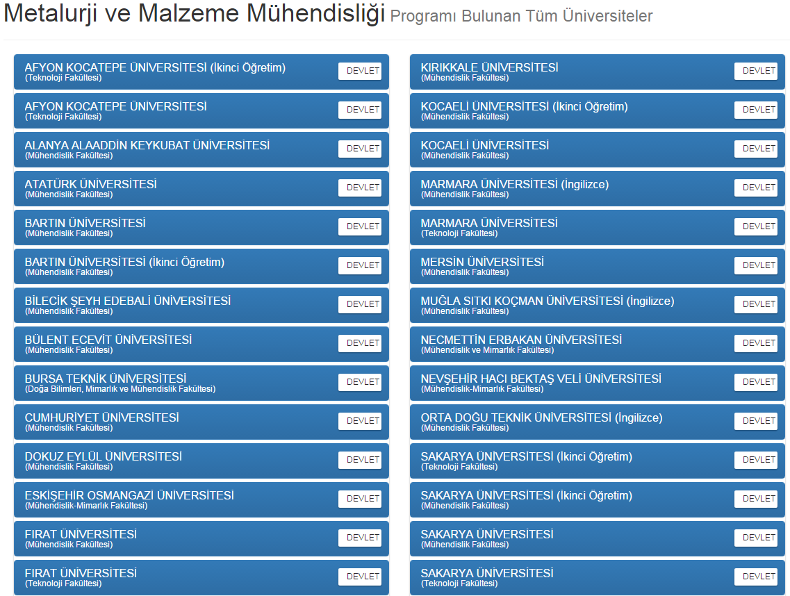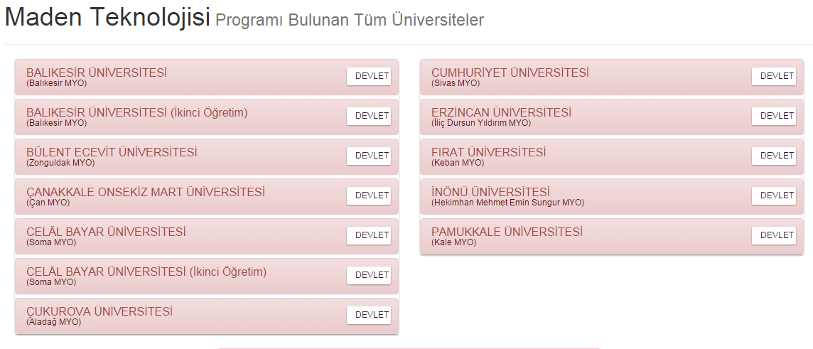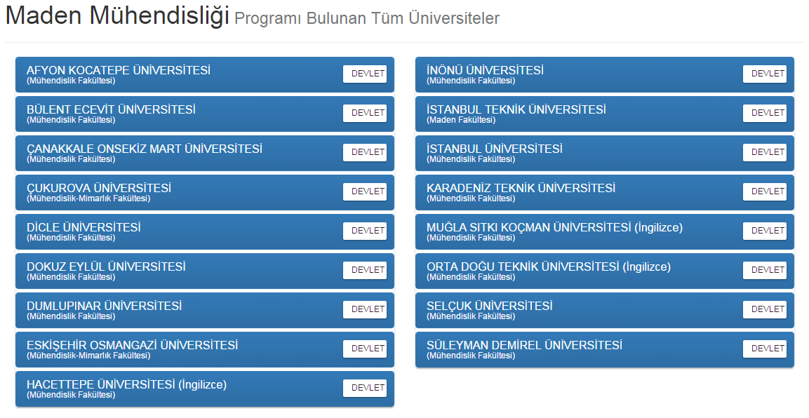 Merhaba değerli ziyaretçi aşağıda, Türkiyedeki Üniversitelerde bulunan Maden Teknolojisi Programları ve bu programlardan mezun olduktan sonra DGS Dikey Geçiş Sınavı ile geçilbilecek Mühensilik bölümleri bulunmaktadır.