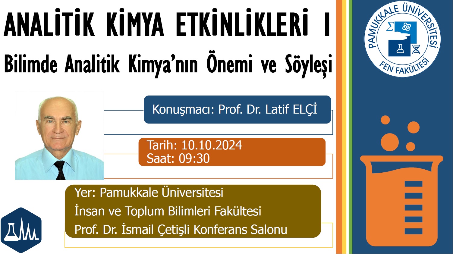 ANALİTİK KİMYA ETKİNLİKLERİ 1: Bilimde Analitik Kimya'nın Önemi ve Söyleşi Söyleşi 10 Ekim 2024 İnsan ve Toplum Bilimleri Fakültesi Prof. Dr. İsmail Çetişli Konferans Salonu