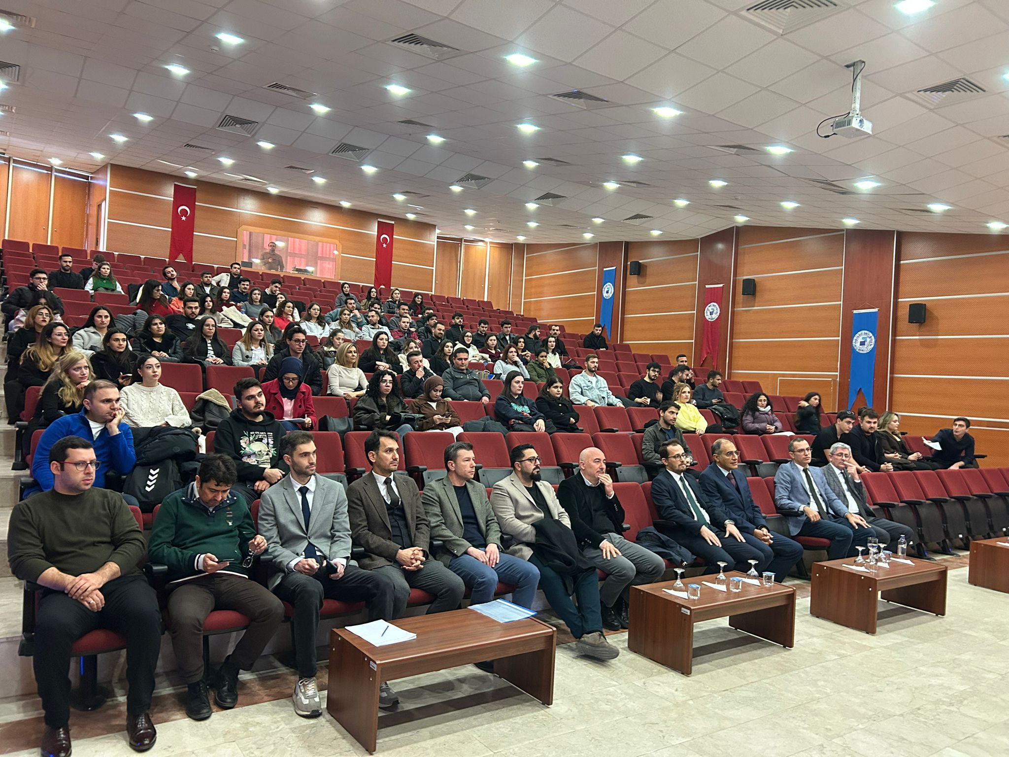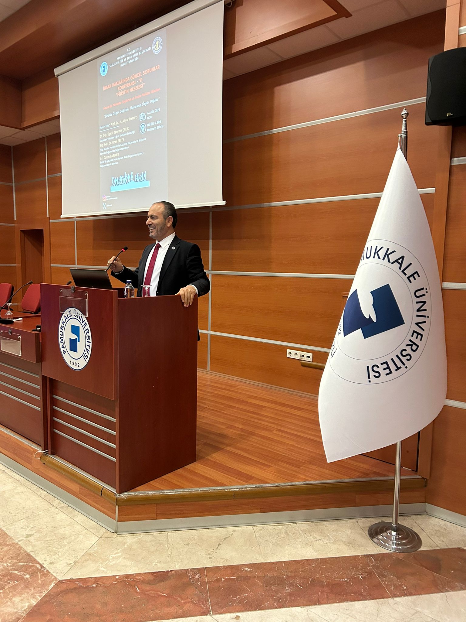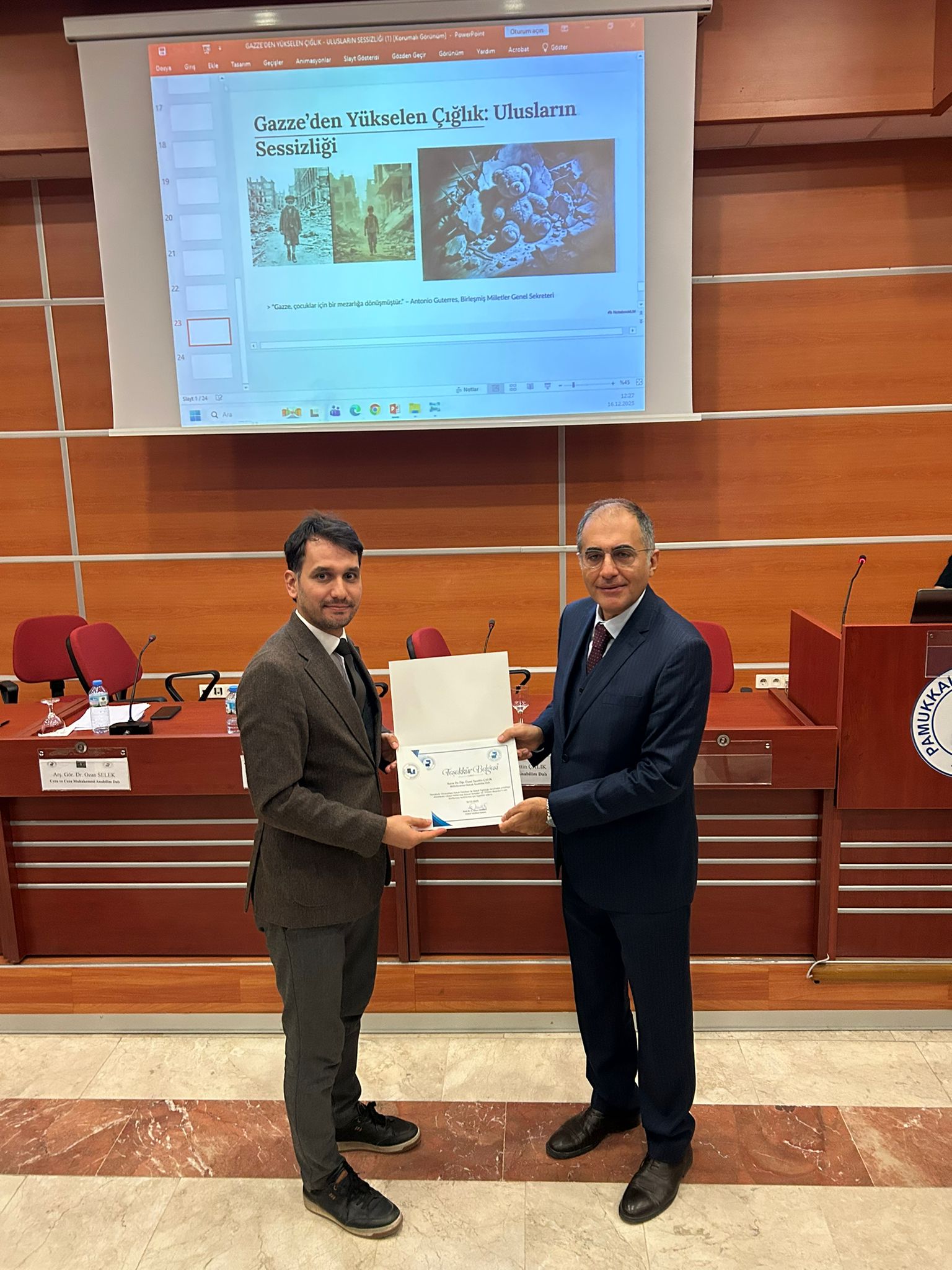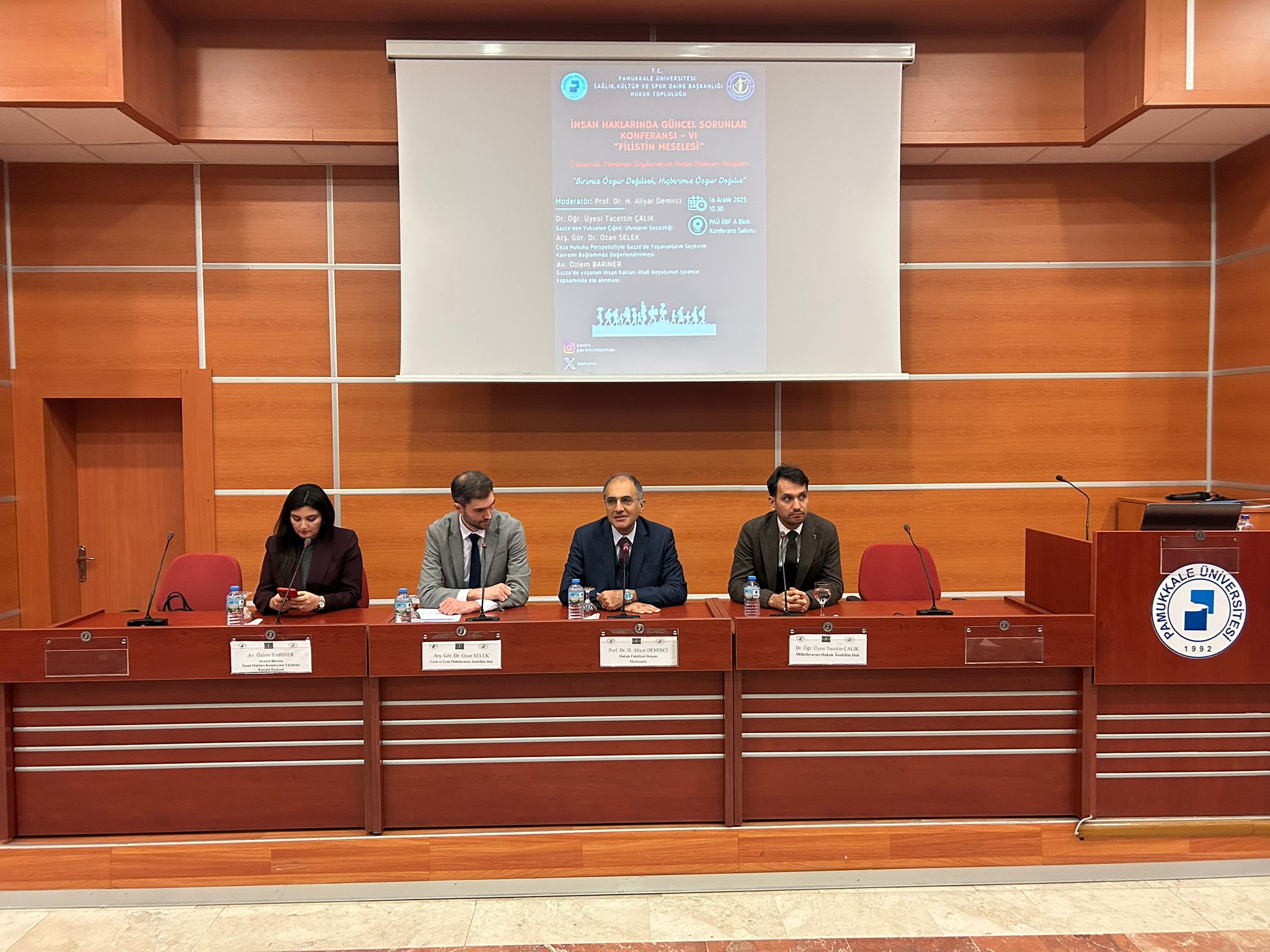 Fakültemiz tarafından, "Filistin Meselesi" konulu İnsan Haklarında Güncel Sorunlar Konferansının altıncısı 16 Aralık 2025 Salı günü İktisadi ve İdari Bilimler Fakültesi A Blok Şehit Bekir Can Kerek Konferans Salonunda gerçekleştirildi. Konferansa; Üniversitemiz Rektörü sayın Prof. Dr. Mahmud GÜNGÖR, Fakültemiz Dekanı sayın Prof. Dr. H. Aliyar DEMİRCİ, İktisadi ve İdari Bilimler Fakültesi Dekanı sayın Prof. Dr. Ender COŞKUN, Fakültemiz öğretim üyeleri ve öğrenciler katıldı. Konferans, Rektörümüz Prof. Dr. Mahmud GÜNGÖR'ün açılış konuşmasıyla başladı. Moderatörlüğünü Fakültemiz Dekanı Prof. Dr. H. Aliyar DEMİRCİ'nin yaptığı konferansa, Fakültemiz Kamu Hukuku Bölümü Milletlerarası Hukuk Anabilim Dalında görevli Dr. Öğr. Üyesi Tacettin ÇALIK, Ceza ve Ceza Muhakemesi Anabilim Dalında görevli Arş. Gör. Dr. Ozan SELEK ve Denizli Barosu İnsan Hakları Komisyonu Başkanı Av. Özlem BARINER sundukları bildiriler ile katkı sağladı. Bildirilerin ardından soru-cevap kısmına geçildi. Konferans, moderatör ve Fakültemiz Dekanı Prof. Dr. H. Aliyar DEMİRCİ'nin teşekkür belgelerini vermesi ve toplu fotoğraf çekimiyle sona erdi.