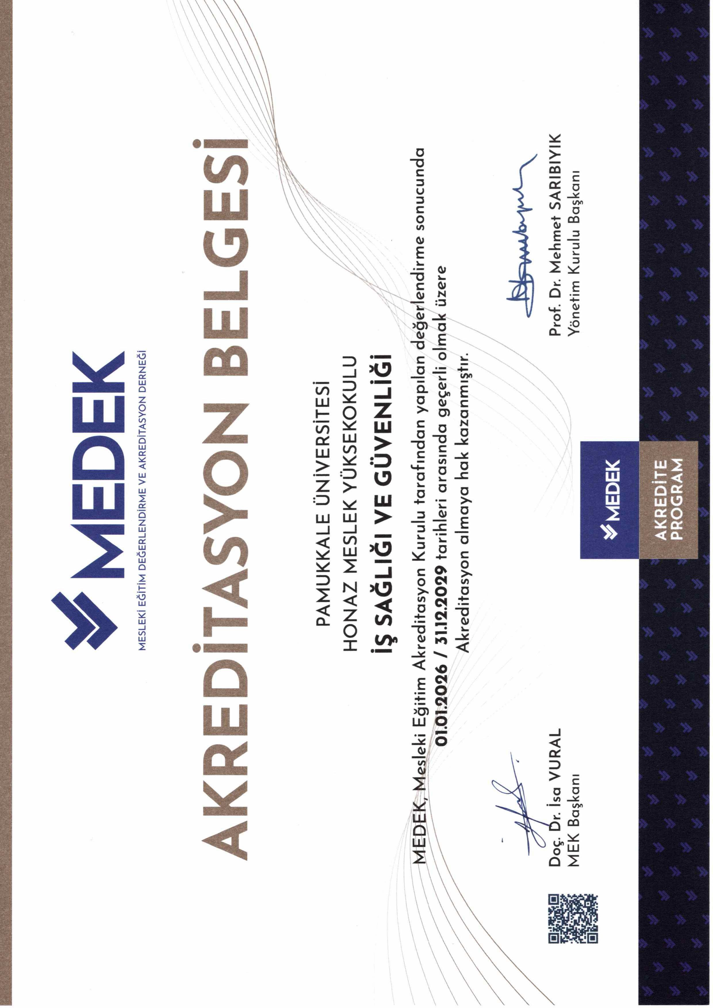 YÜKSEKOKULUMUZ İŞ SAĞLIĞI VE GÜVENLİĞİ PROGRAMI MEDEK TARAFINDAN YAPILAN DEĞERLENDİRME SONUCUNDA TAM AKREDİTASYON ALMAYA HAK KAZANMIŞTIR.