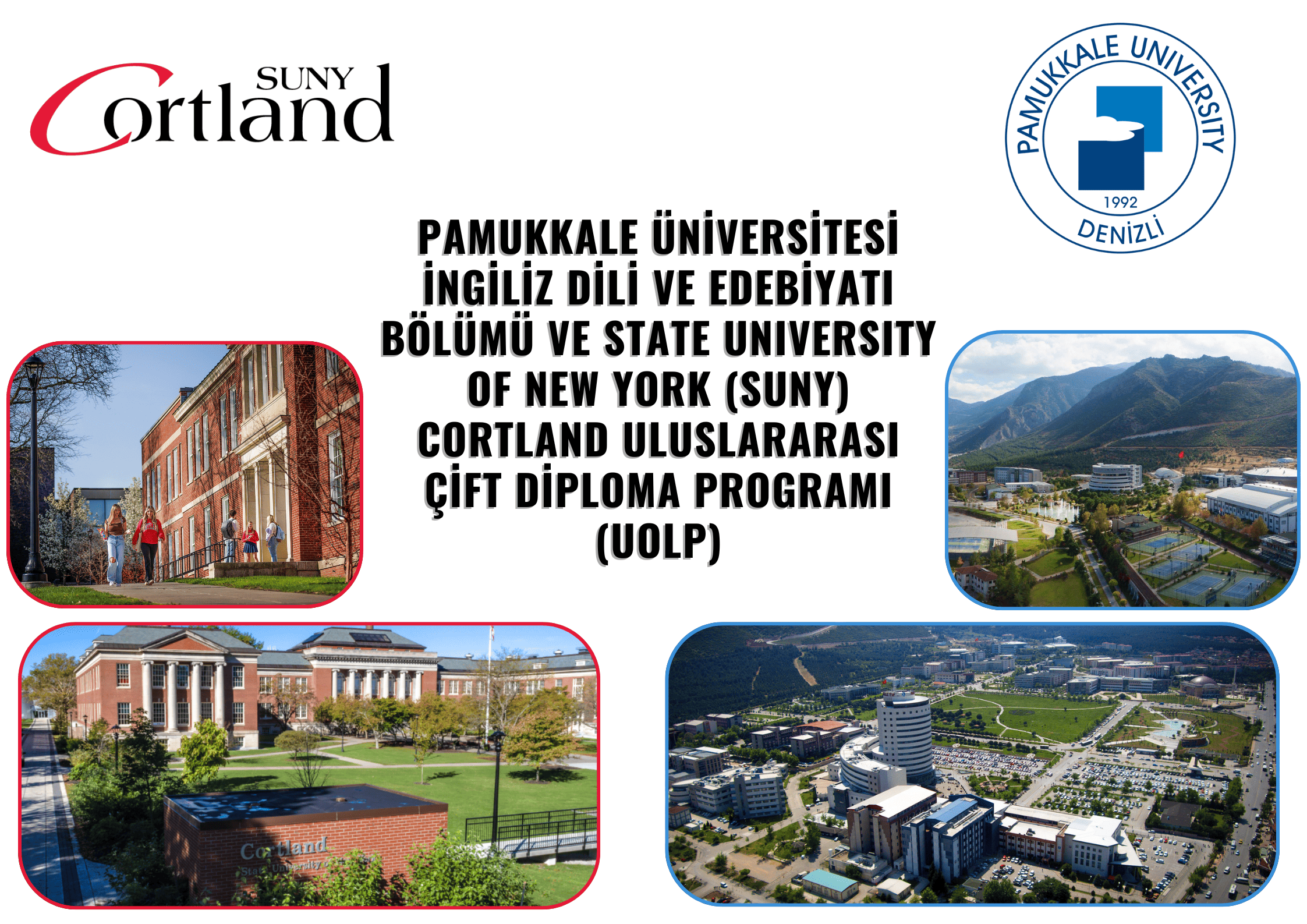 Pamukkale Üniversitesi İngiliz Dili ve Edebiyatı Bölümünün, Amerika Birleşik Devletleri’nin en büyük üniversite sistemi olan State University of New York (SUNY)-Cortland ile Uluslararası Ortak Lisans Programı (UOLP) anlaşması bulunmaktadır. Bu çerçevede tercih kılavuzunda İngiliz Dili ve Edebiyatı (İngilizce) (UOLP-SUNY Cortland) olarak göreceğiniz programı kazandığınız taktirde;
