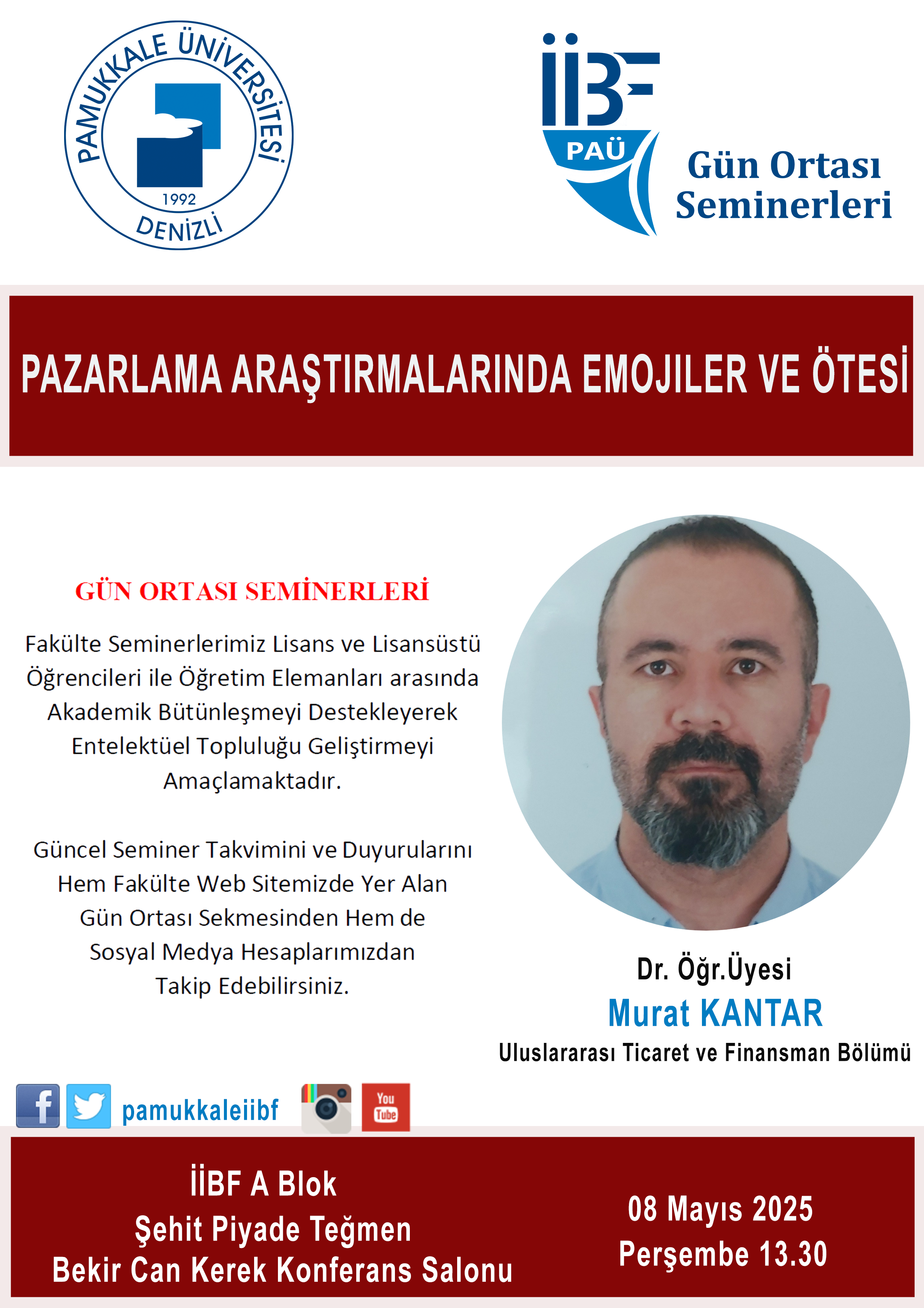 Pazarlama Araştırmalarında Emojiler ve Ötesi Seminer 08 Mayıs 2025 İktisadi ve İdari Bilimler Fakültesi 08 Mayıs 2025 tarihinde Fakültemizde yapılacak olan Pazarlama Araştırmalarında Emojiler ve Ötesi konulu seminerimize tüm akademisyenlerimizi ve öğrencilerimizi bekleriz.