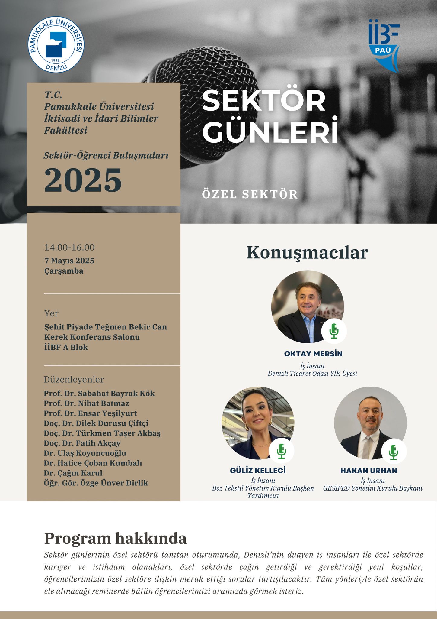 Sektör Günleri: Özel Sektör Söyleşi 07 Mayıs 2025 İktisadi ve İdari Bilimler Fakültesi 07 Mayıs 2025 tarihinde Fakültemizde yapılacak olan Sektör Günleri: Özel Sektör konulu söyleşimize tüm akademisyenlerimizi ve öğrencilerimizi bekleriz.