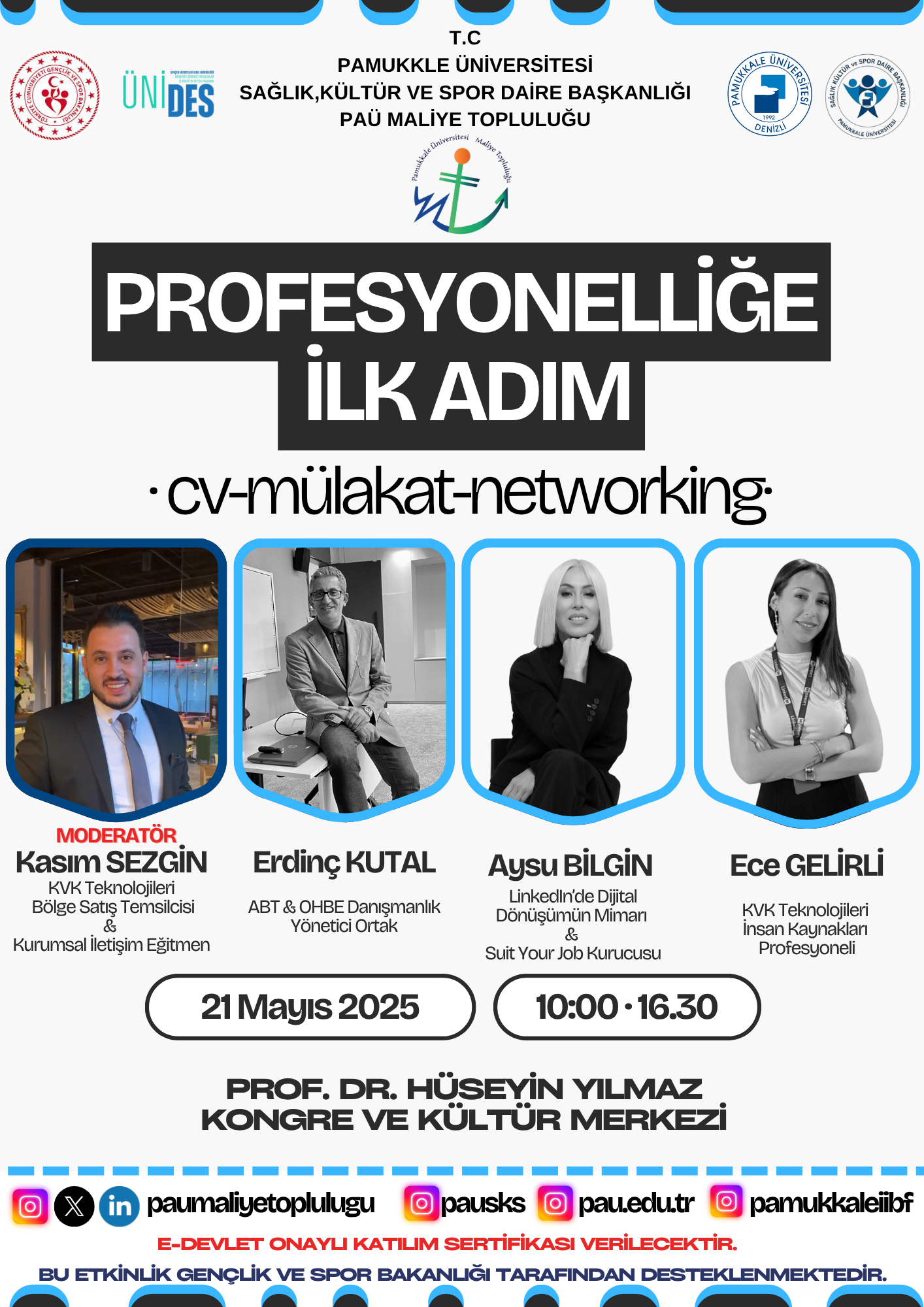 ‘‘Sektör Günleri: Profesyonelliğe İlk Adım CV-Mülakat-Networking’’ Söyleşi 21 Mayıs 2025 PAÜ Prof. Dr. Hüseyin Yılmaz Kongre ve Kültür Merkezi 21 Mayıs 2025 tarihinde Prof. Dr. Hüseyin Yılmaz Kongre ve Kültür Merkezinde yapılacak olan ‘‘Sektör Günleri: Profesyonelliğe İlk Adım CV-Mülakat-Networking’’ konulu söyleşimize tüm akademisyenlerimizi ve öğrencilerimizi bekleriz.