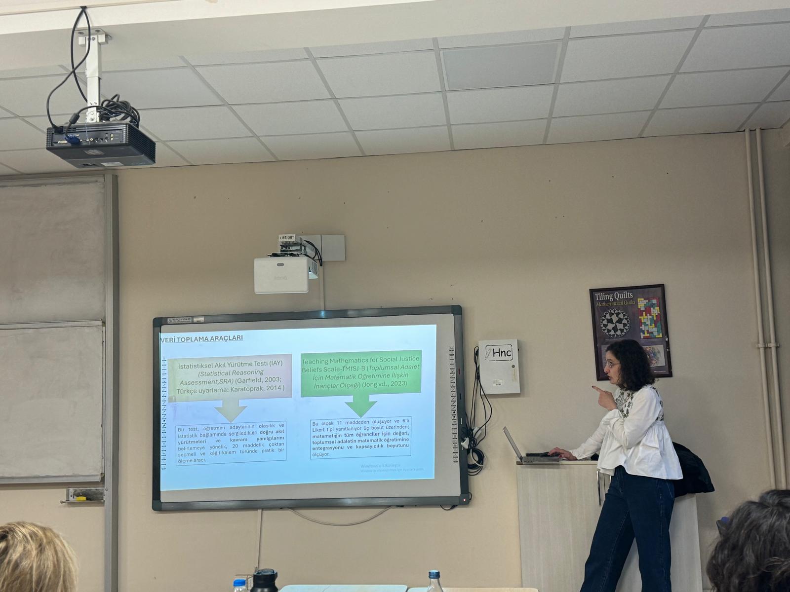 - Yüksek lisans öğrencimiz Başak ÖZER, danışmanı Prof. Dr. Asuman DUATEPE PAKSU rehberliğinde yürüttüğü “Eleştirel Matematik Eğitimi” başlıklı çalışmasına ilişkin olarak yöntemsel yaklaşımına dair planladıklarını katılımcılarla paylaşmıştır. Sunum sonrasında çalışmanın matematik eğitimi alanındaki konumlanışı, araştırma odağının netleştirilmesi ve tez yönelimlerine ilişkin olası seçenekler üzerine geri bildirim ve öneriler tartışılmıştır.