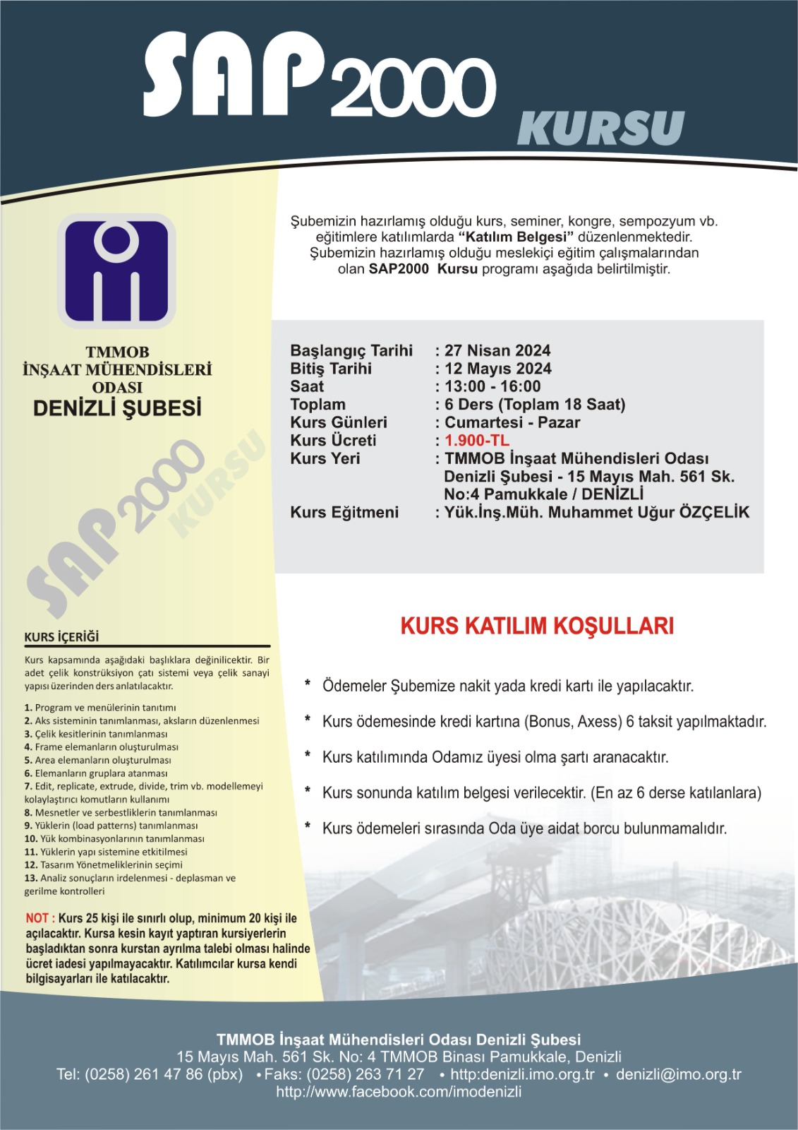 İMO - Denizli Şubesi Sertifika Duyurusu Güncellenme Tarihi: 28 Nisan 2024 İMO Denizli Şubesi tarafından düzenlenmekte olan SAP2000 duyurusu ektedir. Öğrencilerimiz ilerleyen dönemlerde benzeri eğitimler düzenlemesine yönelik olarak İMO - Denizli Şubesi ile iletişime geçebilirler..