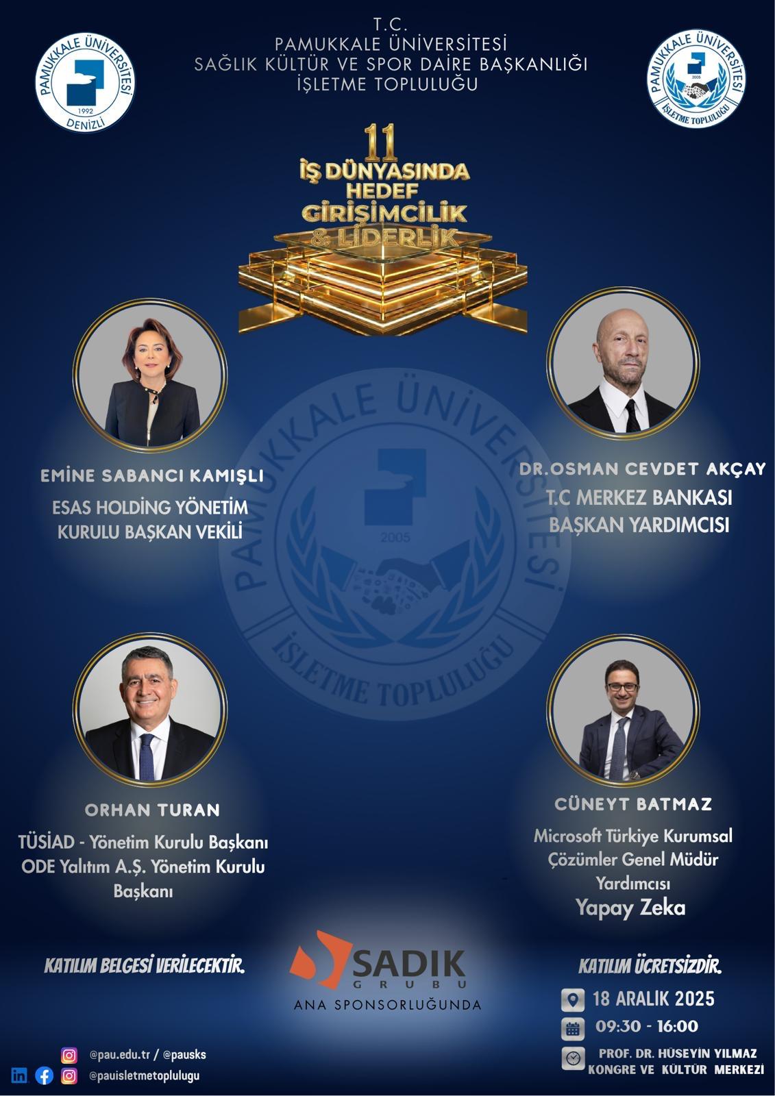 "İş Dünyasında Hedef: Girişimcilik ve Liderlik Zirvesi" Etkinlik 18 Aralık 2025 PAÜ Prof. Dr. Hüseyin Yılmaz Kongre ve Kültür Merkezi 18 Aralık 2025 tarihinde İşletme Topluluğu tarafından düzenlenen "İş Dünyasında Hedef: Girişimcilik ve Liderlik Zirvesi" konulu etkinliğe tüm öğrencilerimiz ve öğretim elemanlarımız davetlidir.