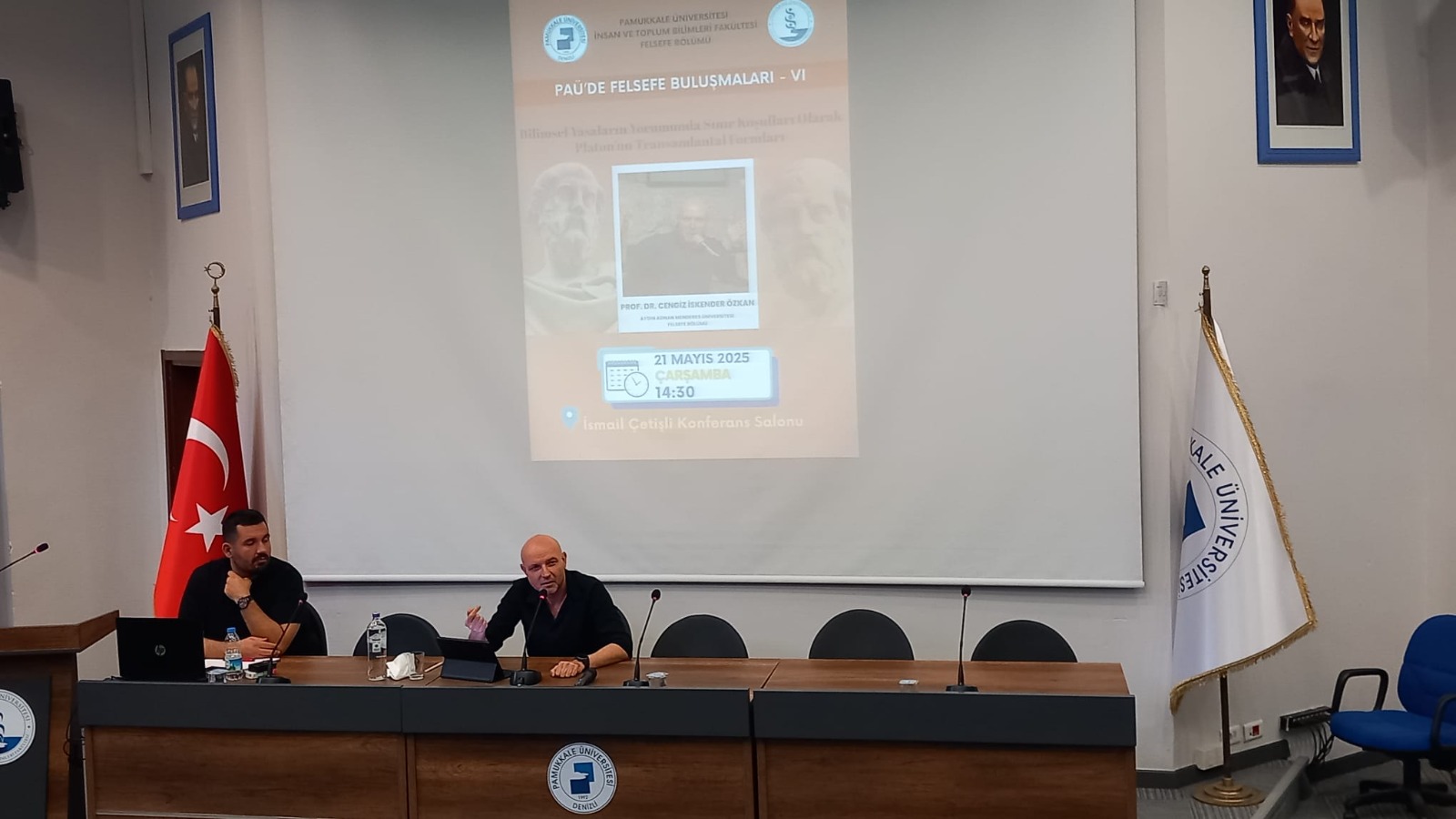 Organized by the Department of Philosophy at the Faculty of Humanities and Social Sciences at Pamukkale University, the sixth session of the “Philosophy Gatherings at PAÜ” series took place on May 21, 2025, at 14:30 in the Prof. Dr. İsmail Çetişli Conference Hall. The event began under the moderation of Research Assistant Bahadır Söylemez and featured a presentation by Prof. Dr. Cengiz İskender Özkan titled “Plato’s Transcendental Forms as Boundary Conditions in the Interpretation of Scientific Laws.”