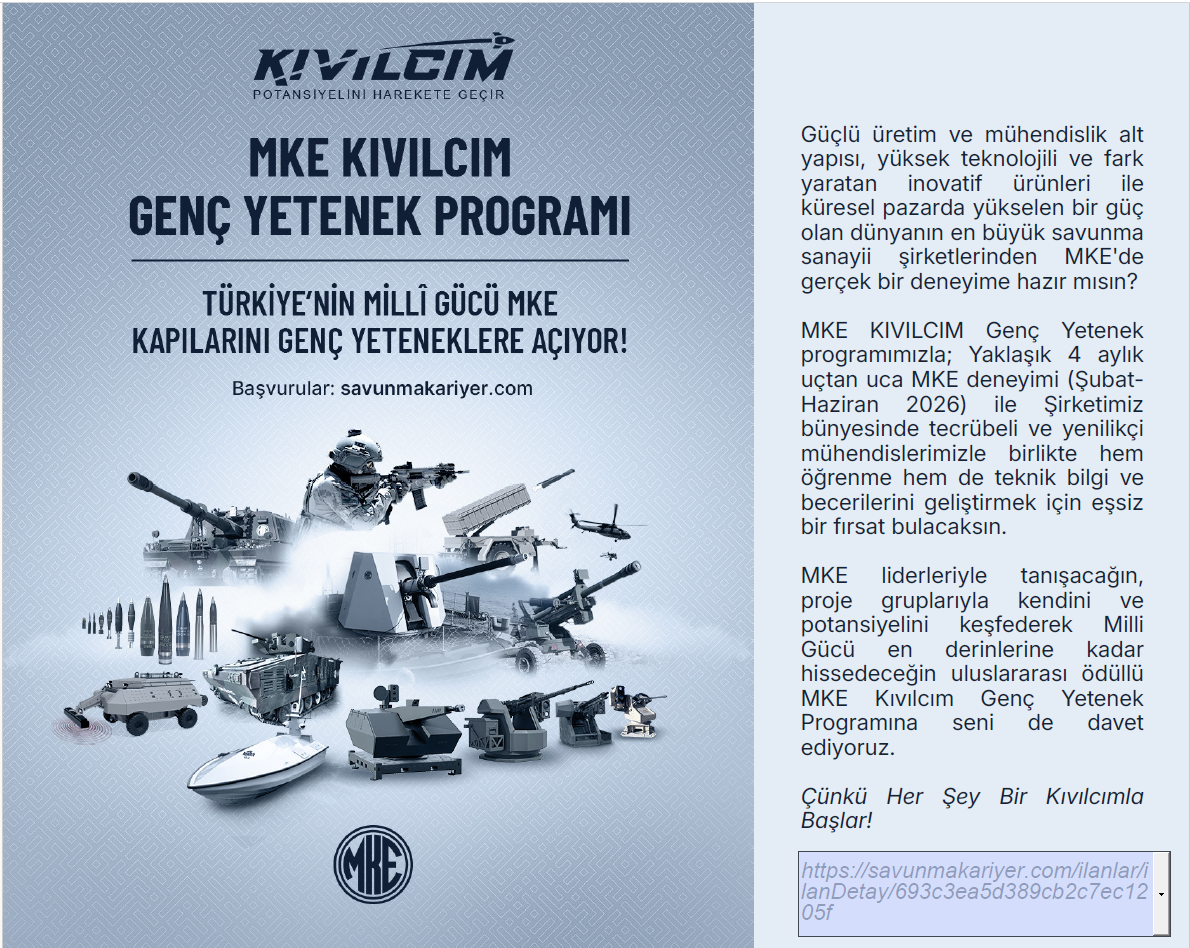 BAŞVURU İÇİN https://savunmakariyer.com/ilanlar/ilanDetay/693c3ea5d389cb2c7ec1205f