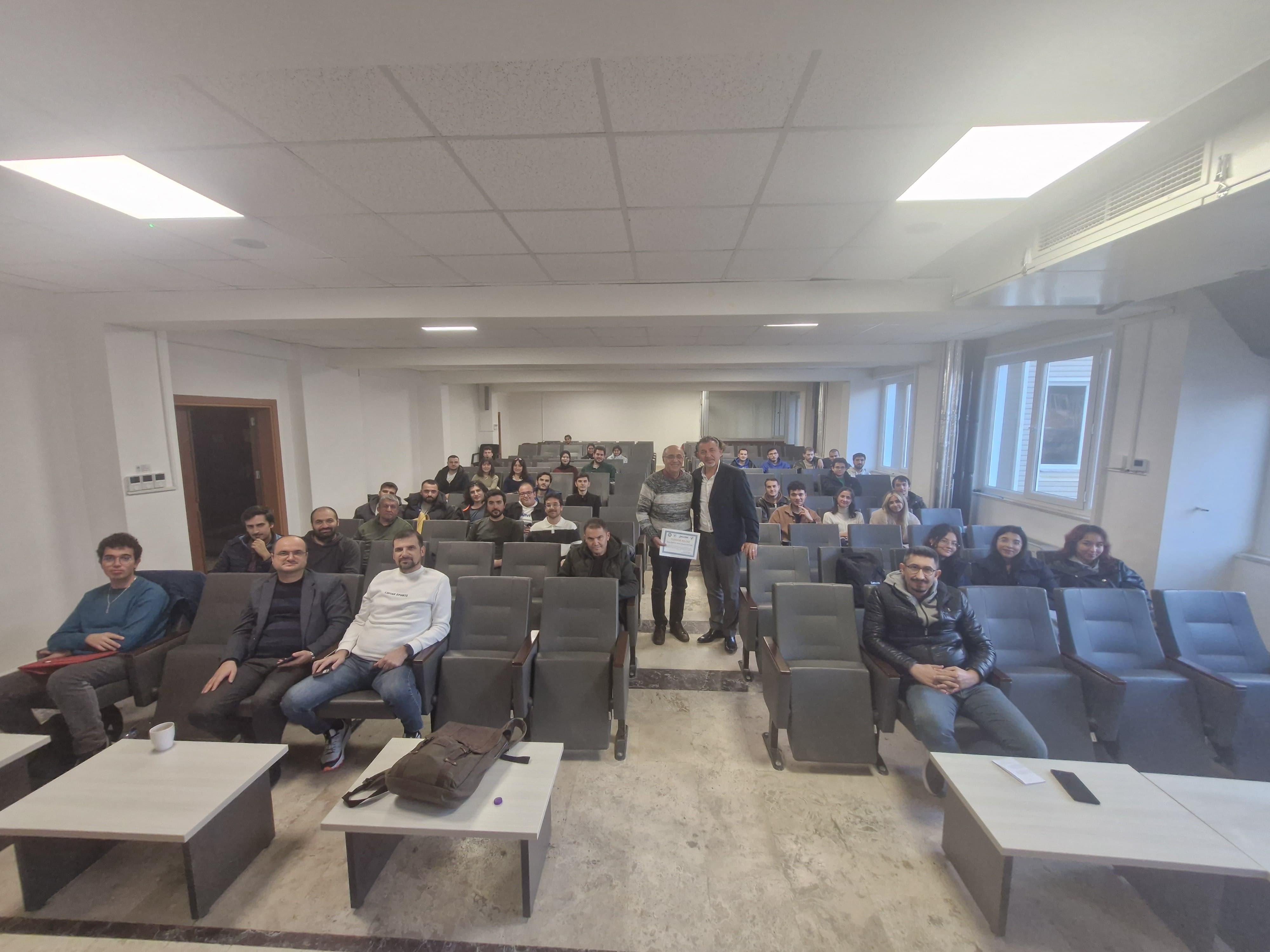 The seminar titled "The New Engineer's Journey to Self-Actualization" was held, featuring a presentation by Mr. Serkan UÇKAN, a 2009 graduate of Pamukkale University, Faculty of Engineering, Department of Mechanical Engineering. Mr. UÇKAN is currently the owner of Uçkan Test and Measurement Systems and the official distributor for all Instron products in Turkey and Azerbaijan. During the seminar, Mr. Serkan shared the milestones of his journey to his current position, the challenges he faced, the decisions he made while climbing the career ladder, his occasional failures, how he developed himself, and his memories of Pamukkale University with the audience. The event we organized was highly productive. Our Head of Department, Prof. Dr. Cemal MERAN, presented a certificate of appreciation to Mr. Serkan UÇKAN for this wonderful seminar.