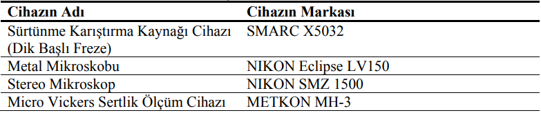 The devices belonging to the Friction Stir Welding Research Laboratory are given in Table 1.