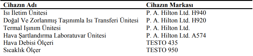 In this laboratory, applications of thermodynamics, heat transfer and air conditioning courses are carried out. The list of devices belonging to the thermodynamics laboratory is given in Table 1.