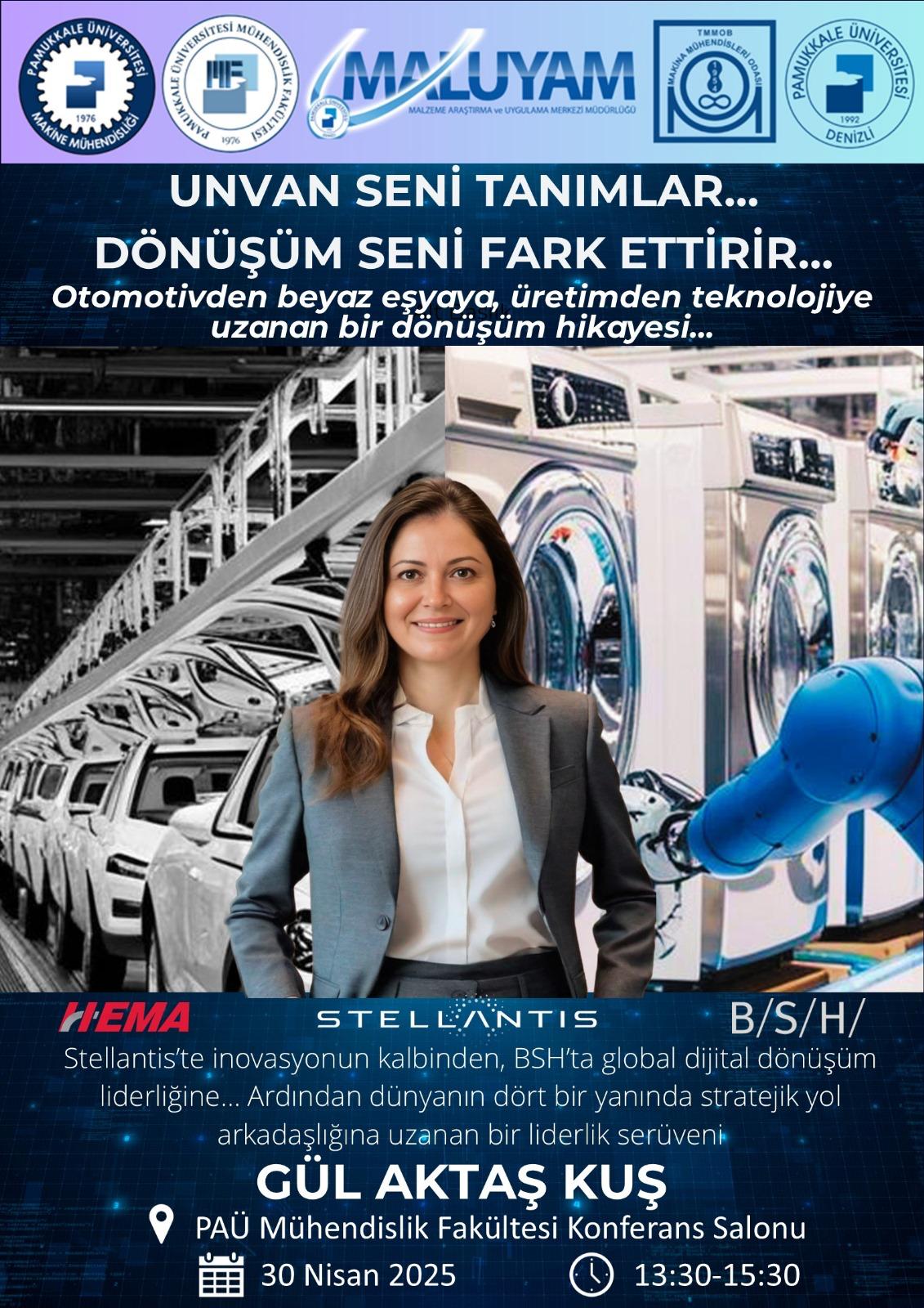 Otomotivden Beyaz Eşyaya, Üretimden Teknolojiye Uzanan Bir Dönüşüm Hikayesi / Gül AKTAŞ KUŞ Söyleşi 28 Nisan 2025 - 06 Temmuz 2030 Mühendislik Fakültesi Konferans Salonu Sahne Alanlar: Gül AKTAŞ KUŞ