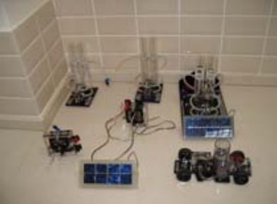 Elektrik üretim sistemi ise iki ana bileşenden oluşmaktadır. Bunlar; güneş pili panelleri (Şekil 3) ve yakıt pilleridir (Şekil 4). Böylece, elektrik üretimi, güneşten ve hidrojenden karşılanabilmektedir. Bu amaçla, güneş enerjisinden doğrudan elektrik üretiminin yapılabildiği güneş pili panelleri kullanılmaktadır. Ayrıca enerji taşıyıcısı olan hidrojen, güneş enerjisinden üretilen elektriğin elektroliz (Şekil 5) işleminde kullanılması ile elde edilerek katı halde (metal hidrid tanklarda) depolanmakta ve ihtiyaç halinde yakıt pillerinde, hidrojenden elektrik üretilebilmektedir. Güneş enerjisinin akülere depolanmasında ve daha sonra evin ihtiyacında kullanılabilmesi için şarj regülatörleri ve invertörlerden faydalanılmaktadır (Şekil 6).