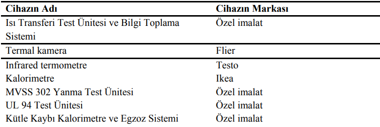 Yanma laboratuvarına ait cihazlar Tablo 1'de verilmiştir.