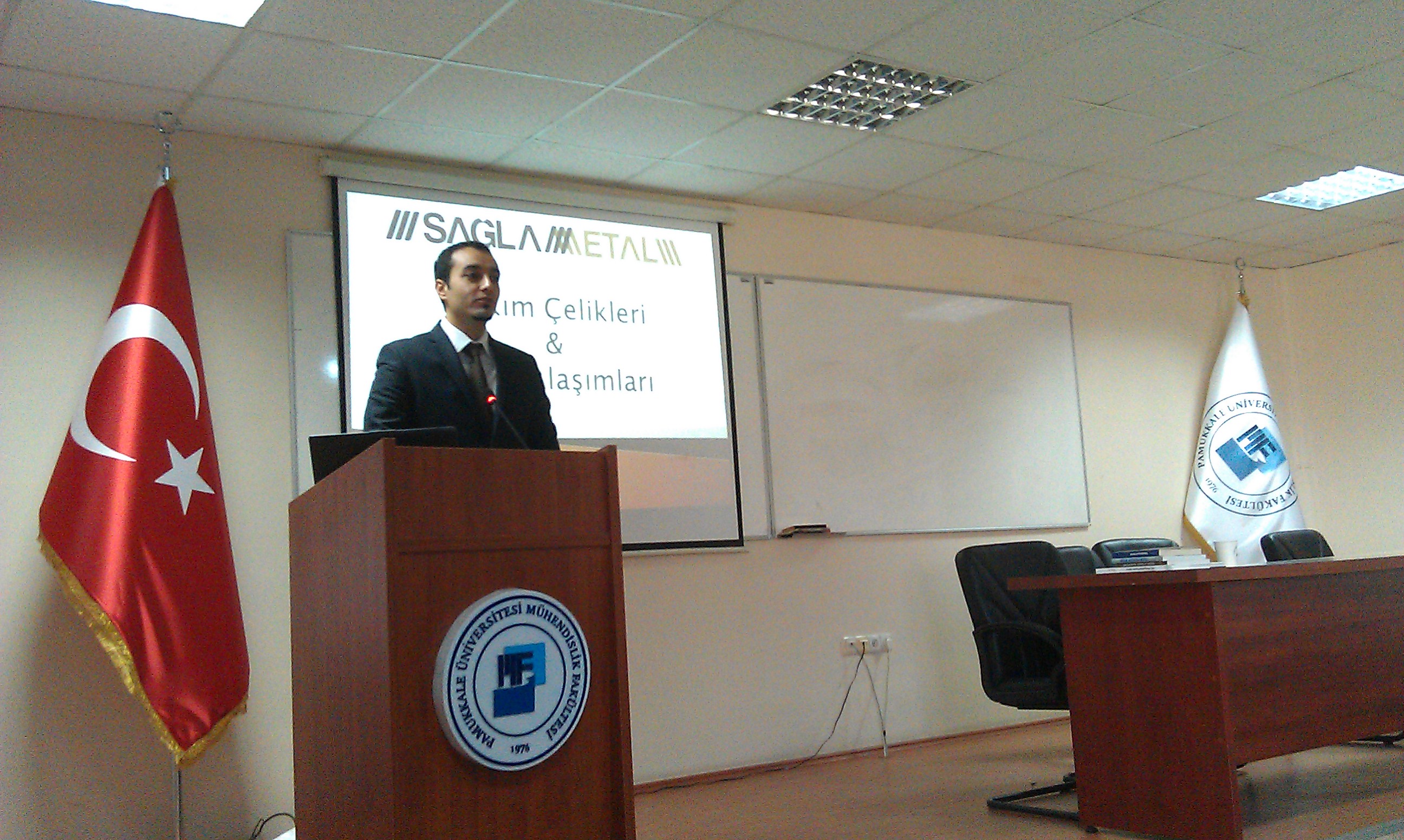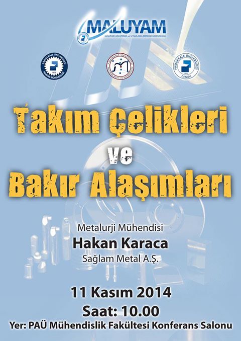 Takım Çelikleri ve Bakır Alaşımları Semineri Güncellenme Tarihi: 11 Kasım 2014 11.11.2014 salı günü Mühendislik Fakültesi konferans salonunda Bölümümüz ve Makine Mühendisliği ortak organizasyonunda Sağlam Metal A.Ş.' den Metalurji ve Malzeme Mühendisi Hakan KARACA Takım çelikleri ve bakır alaşımları hakkında seminer düzenlemişlerdir.
